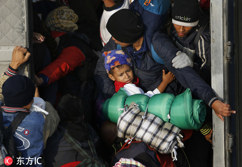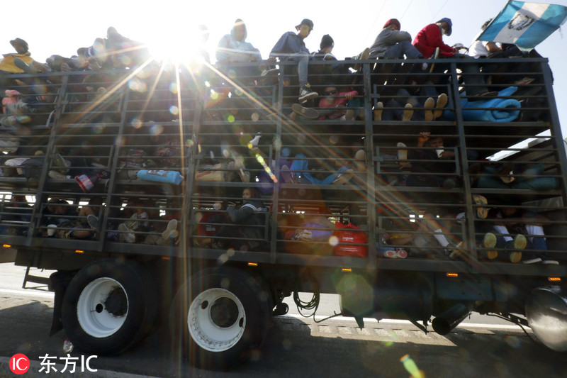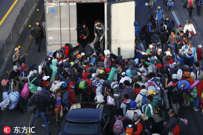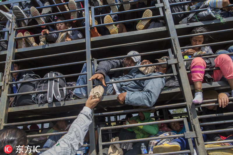 中美洲移民乘“大篷车”前往美国 卡车上下四层挤满人