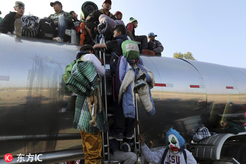 当地时间2018年11月11日,墨西哥塞拉亚,中美洲移民爬上汽车顶部前往美墨边境。中美洲大篷车移民穿过墨西哥,继续向美国前进。