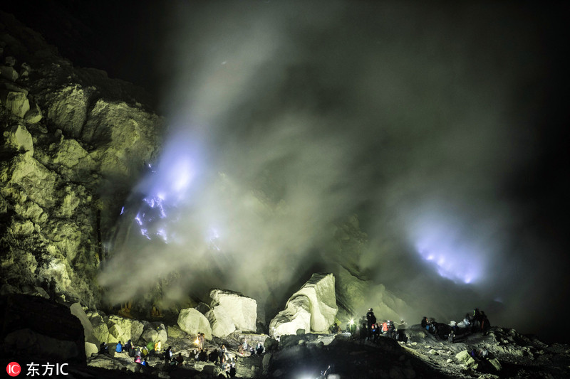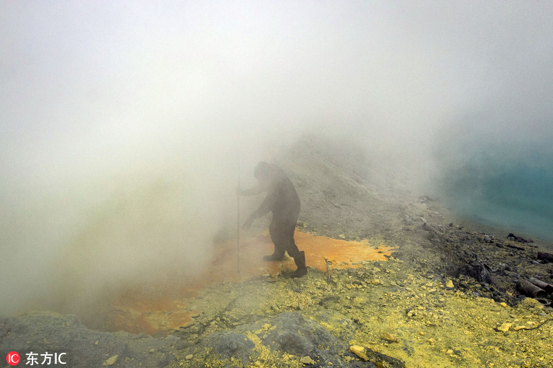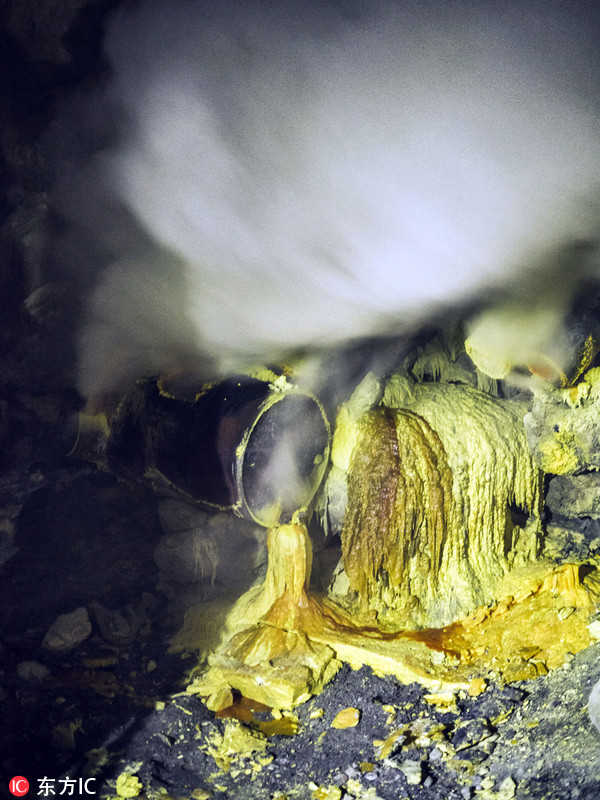 就是在这样如地狱般的环境中,硫磺工人们不得不冒着生命危险,为一家人的生计忙碌着,用铁杆将冷却的硫磺敲下来装框,从谷底挑到山顶,再从山顶送到山下。