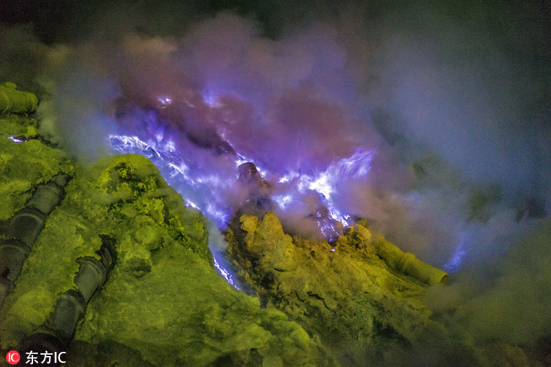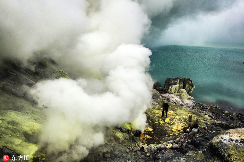 瓦伊真火山,一座位于东爪哇外南梦的活火山,山顶是天堂般静美的碧绿色火山口湖,谷底却是地狱般恶劣的硫磺采集地,这里不分昼夜浓烟滚滚,幽蓝色的火山不时喷发,山石和地面被黄色的硫磺粉末覆盖,未凝固的硫磺液体滚滚流淌,黄色的硫磺气体翻涌升腾,刺入鼻腔令人窒息。