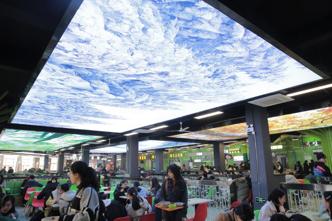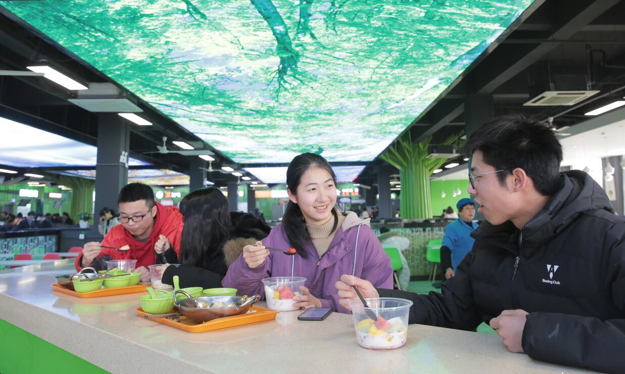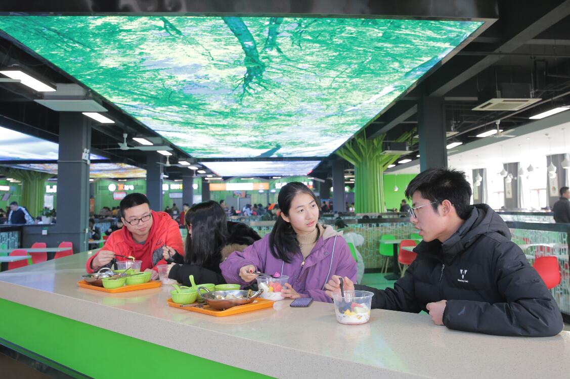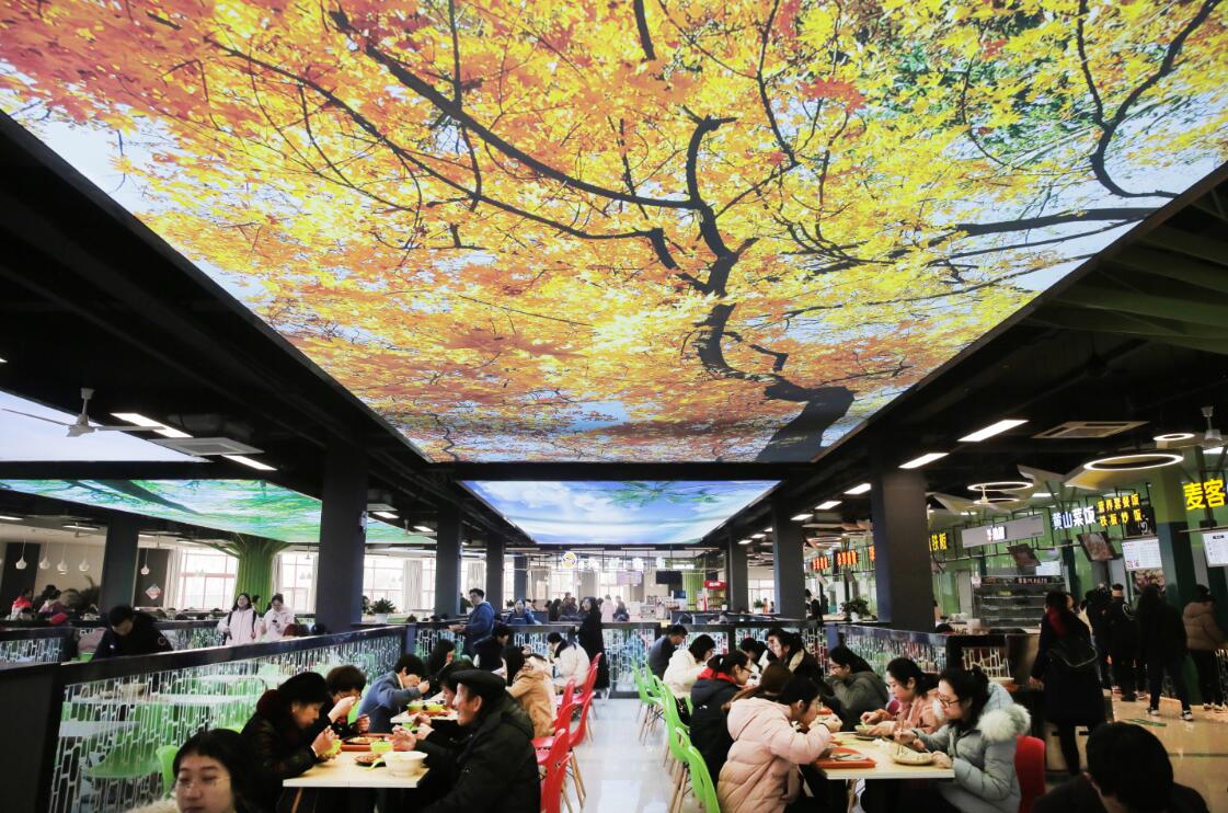 2019年3月7日,学生们在浙江农林大学的西径二楼食堂用餐。 食堂翻新之后,在吊顶安装了四块超大尺寸幕布,投射四季自然风光,同学们可以一边吃饭一边欣赏美景。 图片署名:浙报传媒-东方IC 李翔 陈胜伟 王莉波