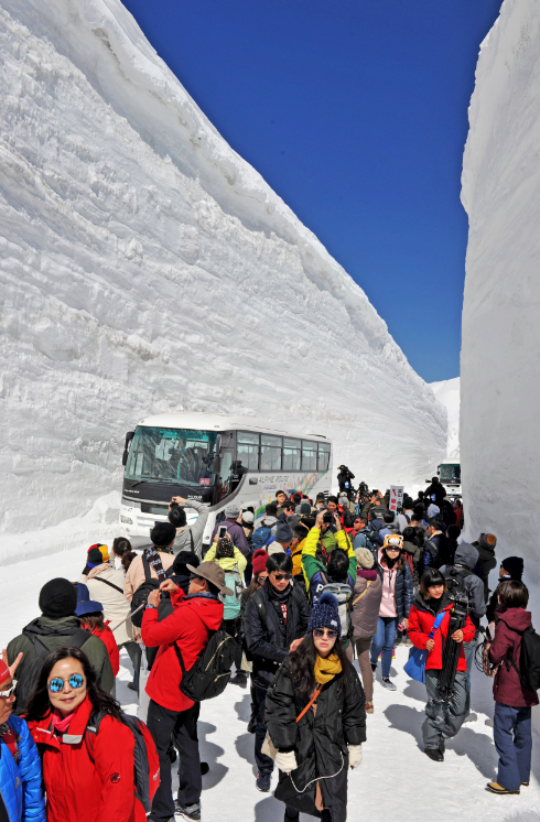 当地时间2019年4月16日,日本富山县立山町,日本著名的“雪墙公路”(Tateyama Kurobe Alpine Route)对公众开放,两侧积雪高达16米,吸引大批游客。