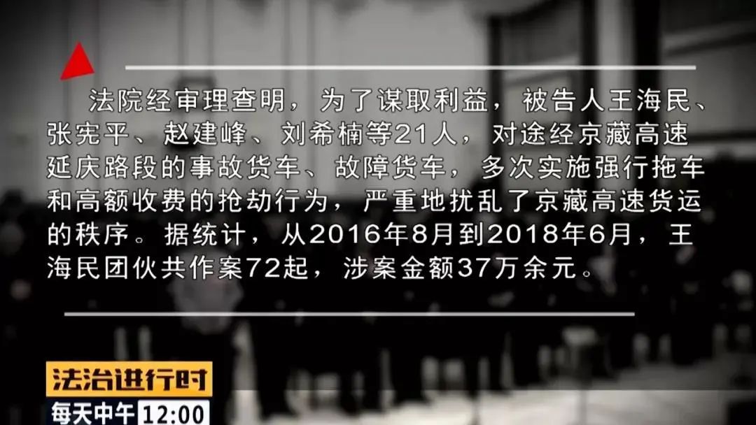 法院经审理查明,为了谋取利益,被告人王海民、张宪平、赵建峰、刘希楠等21人,对途径京藏高速延庆路段的事故货车、故障货车,多次实施强行拖车和高额收费的抢劫行为,严重地扰乱了京藏高速货运的秩序。据统计,从2016年8月到2018年6月,王海民团伙共作案72起,涉案金额37万余元。