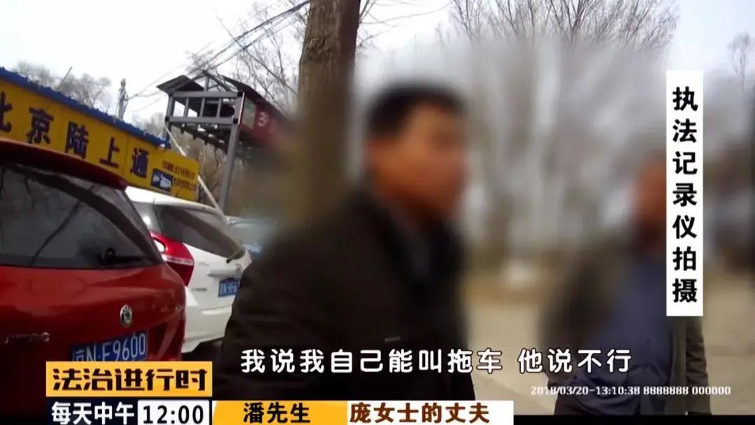 庞女士,50多岁,在延庆区兴民汽车救援公司的大院内,为了能少交一部分拖车费,庞女士苦苦哀求张宪平两个多小时,期间还下跪求情。