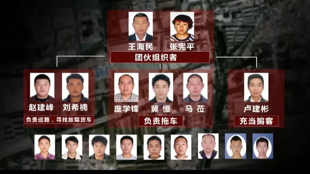 警方调查发现,这个犯罪团伙共有21名成员,分工明确,组织严密,王海民、张宪平夫妇负责全面工作,赵建峰、刘希楠等11人负责巡路,寻找故障货车,庞学锋、冀恒、马莅等7人负责拖车,卢建彬充当掮客,在京藏高速昌平、延庆路段,通过暴力、威胁等手段强行拖车,谋取高额拖车费。