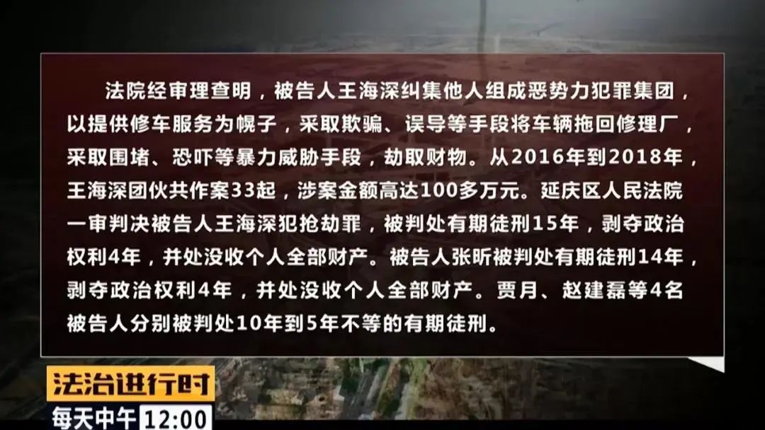法院经审理查明,被告人王海深纠集他人组成恶势力犯罪集团,以提供修车服务为幌子,采取欺骗、误导等手段将车辆拖回修理厂,采取围堵、恐吓等暴力威胁手段,劫取财物。从2016年到2018年,王海深团伙共作案33起,涉案金额高达100多万元。延庆区人民法院一审判决被告人王海深犯抢劫罪,被判处有期徒刑15年,剥夺政治权利4年,并处没收个人全部财产。被告人张昕被判处有期徒刑14年,剥夺政治权利4年,并处没收个人全部财产。贾月、赵建磊等4名被告人分别被判处10年到5年不等的有期徒刑。