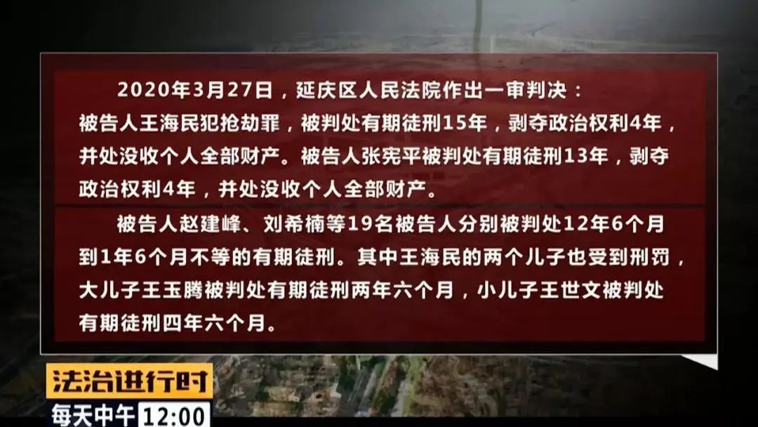 2020年3月27日,延庆区人民法院作出一审判决:被告人王海民犯抢劫罪,被判处有期徒刑15年,剥夺政治权利4年,并处没收个人全部财产。被告人张宪平被判处有期徒刑13年,剥夺政治权利4年,并处没收个人全部财产。被告人赵建峰、刘希楠等19名被告人分别被判处12年6个月到一年6个月不等的有期徒刑。其中王海民的两个儿子也受到刑罚,大儿子王玉腾被判处有期徒刑两年六个月,小儿子王世文被判处有期徒刑四年六个月。