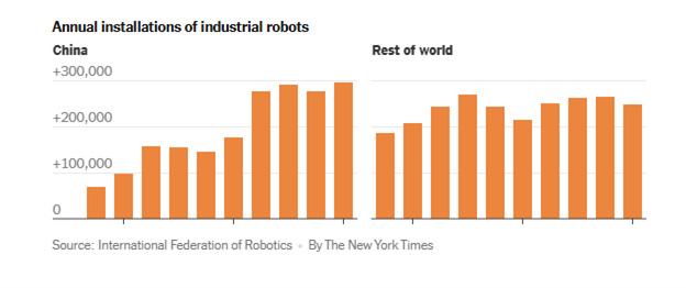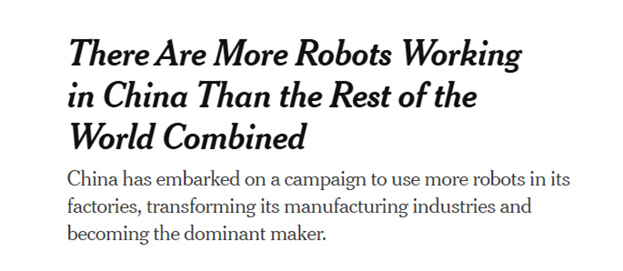全球媒体聚焦 | 《纽约时报》:中国工业机器人年安装量超过世界其他地区总和