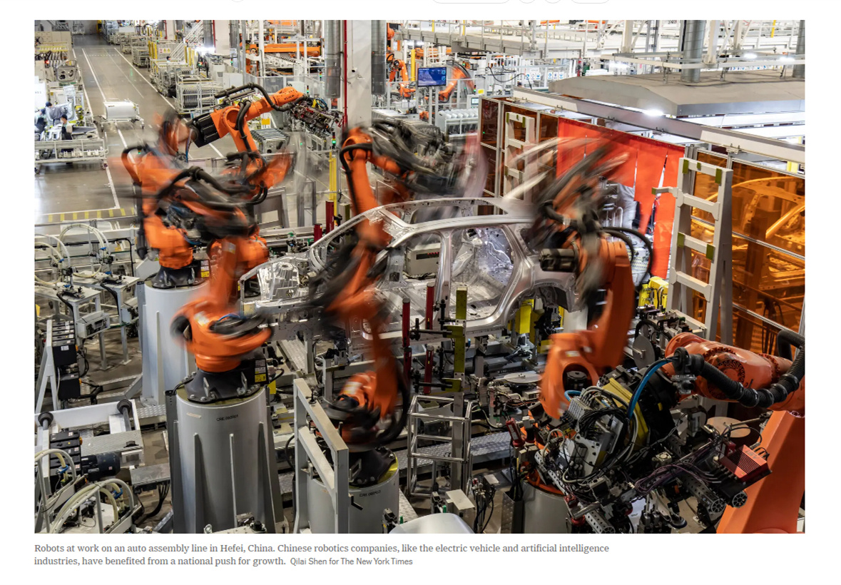 报道强调,在中国工厂加大机器人运用规模的同时,其机器人的制造能力也在提升。中国政府通过资金和政策支持鼓励中国企业发展成为机器人、半导体和人工智能等先进技术领域的领军者。