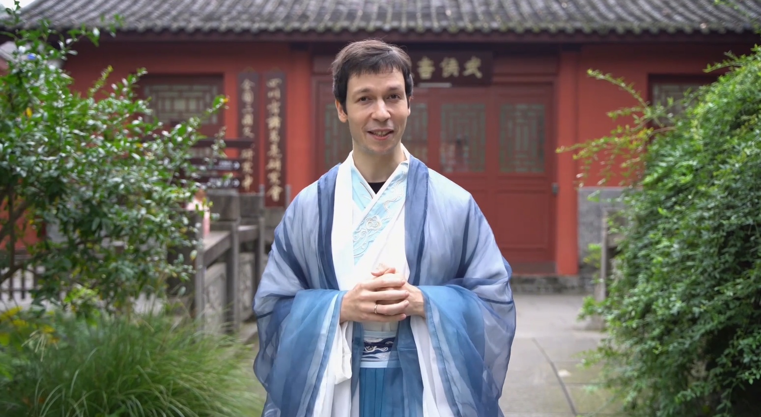 来自德国的克里斯特别喜欢武侯祠。他说,在那里不仅可以欣赏中国传统建筑之美,还能深入了解中国三国时期的历史。穿上一身汉服,仿佛开启一场“穿越古代”的文化之旅。作为汉语言专业的学生,他漫步在武侯祠中,兴致所至,还会向老师请教毛笔书法,学习古诗词,甚至现场吟诵几首经典诗篇,沉浸式感受中华文化的独特魅力。