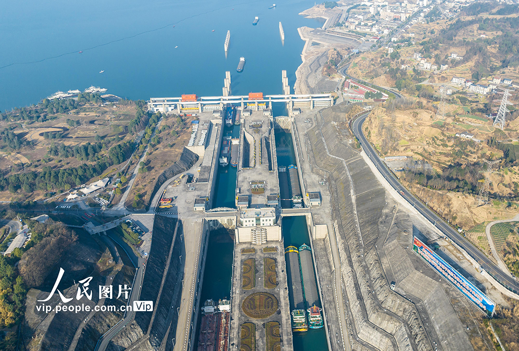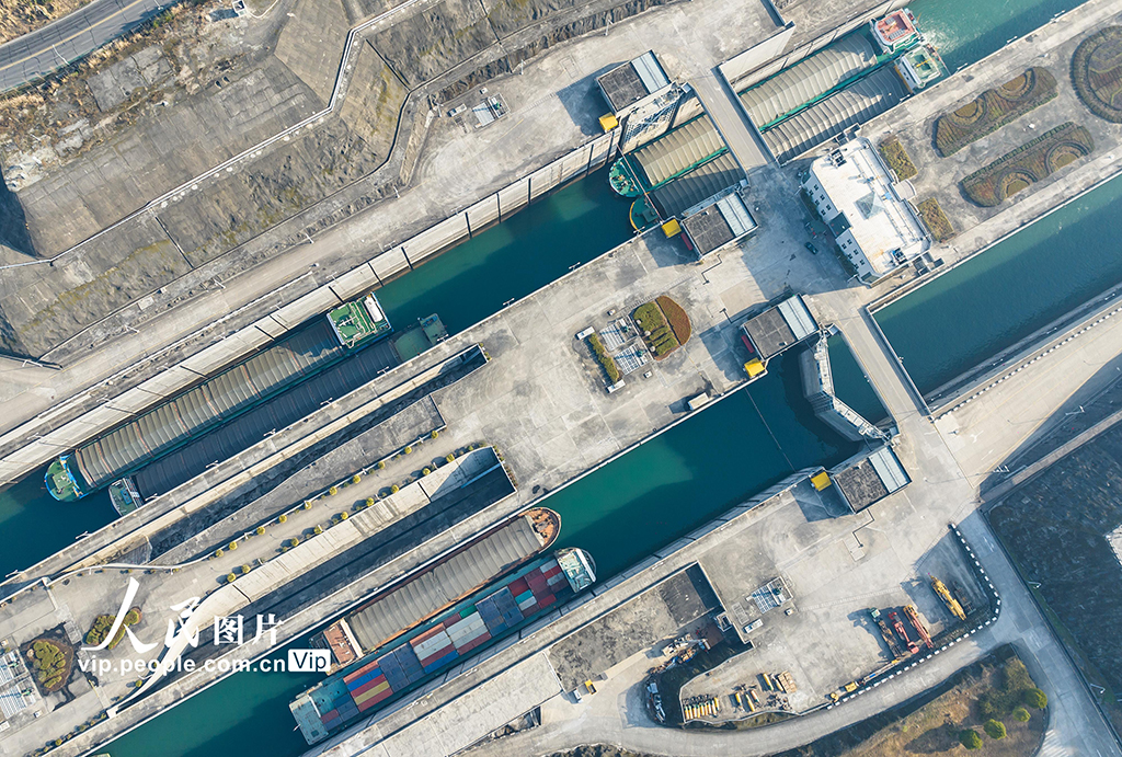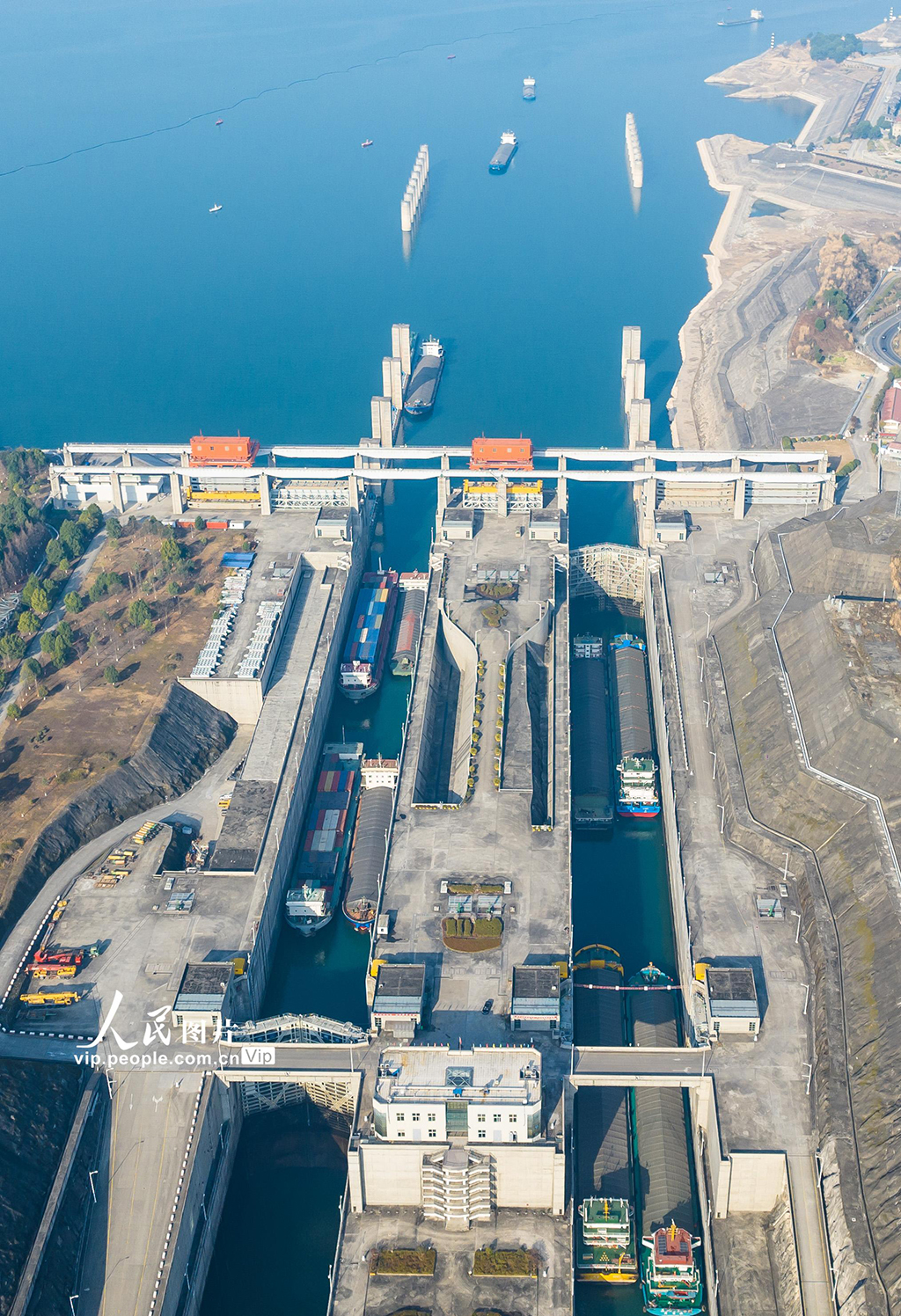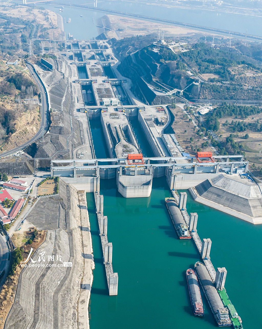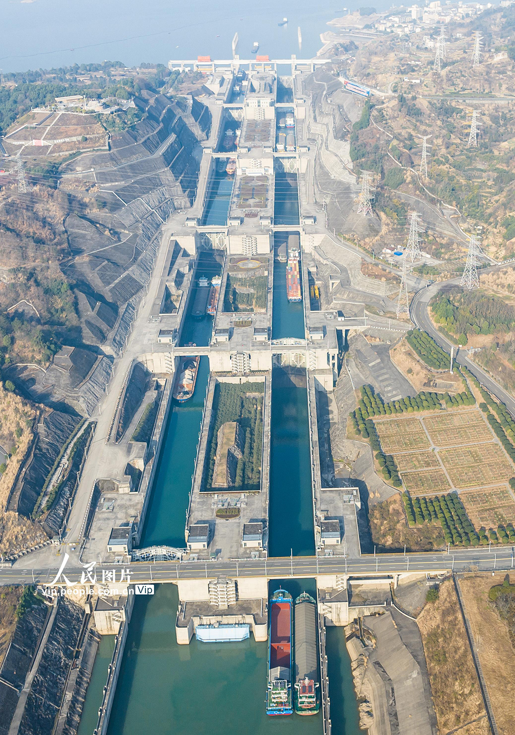 2023年1月29日,长江三峡通航管理局发布消息,春节假期,三峡船闸运行212闸次,通过船舶742艘次,货物通过量304.71万吨,分别同比增长13.98% 、13.62% 、14.20%。三峡枢纽河段保持安全畅通稳定,确保关键通道发挥关键保障作用。郑家裕摄(人民图片网)
