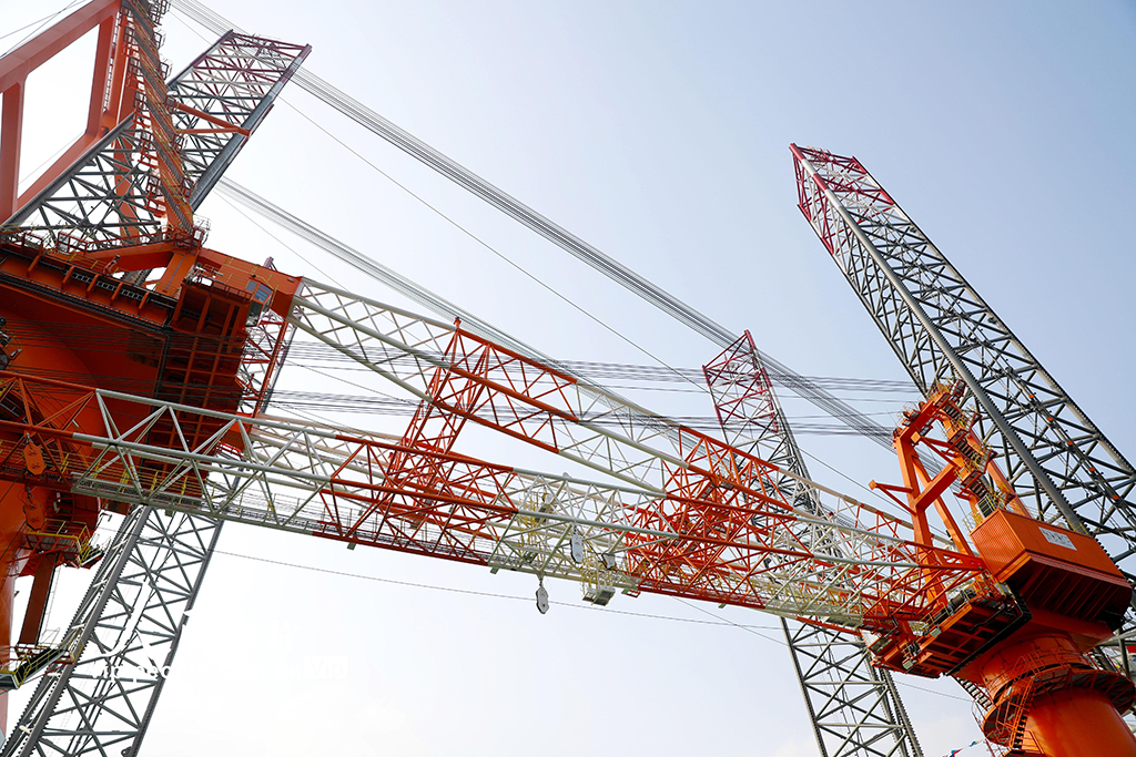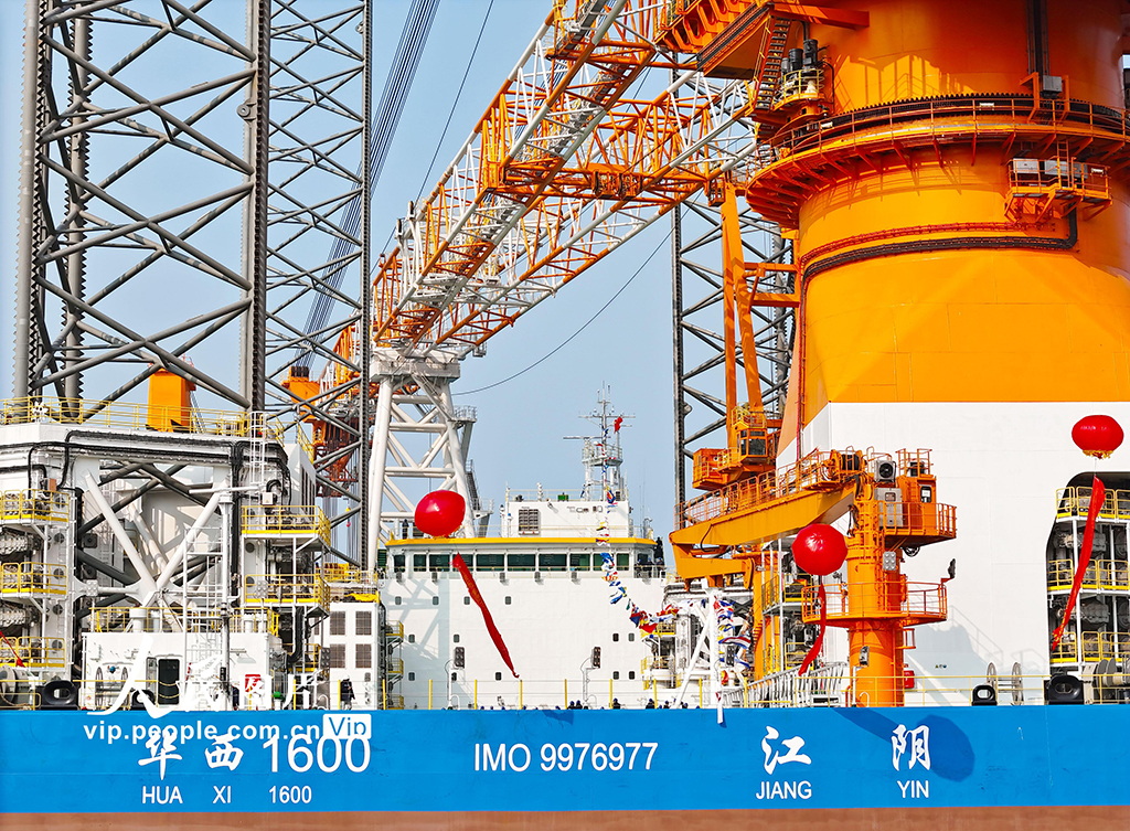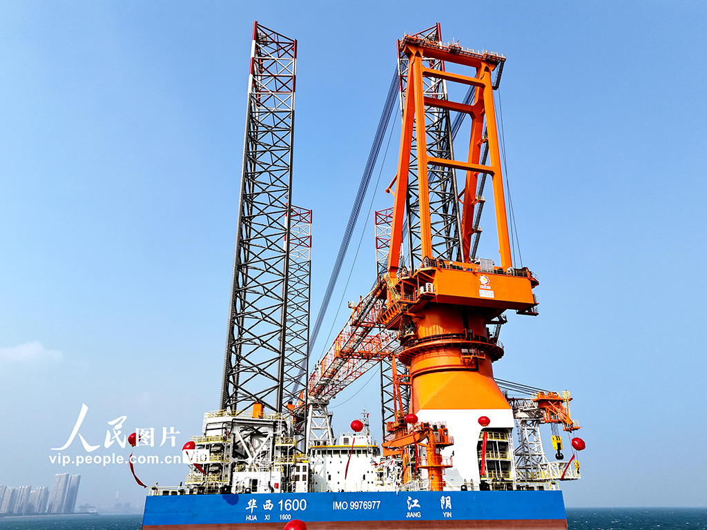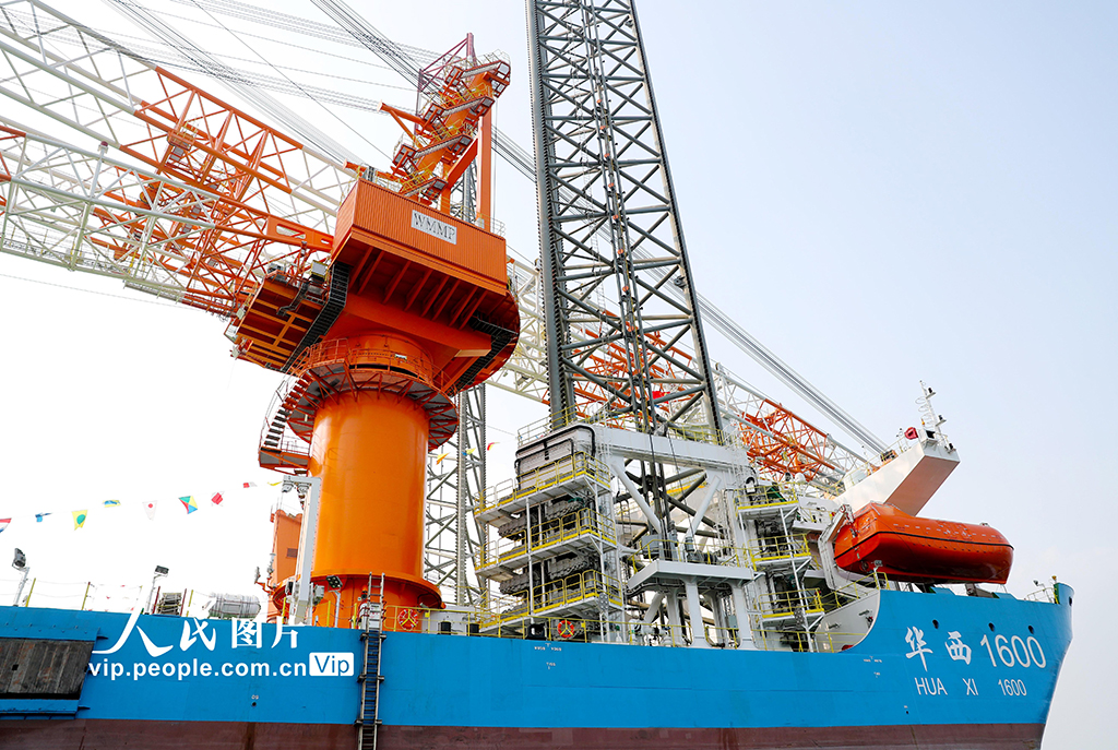11月16日,由中国船舶武汉船机总包建造的“华西1600”1600吨海上自航自升式风电安装平台在位于青岛西海岸新区的青岛海西重机有限责任公司交付。 该平台是我国自主研发设计、具有完全自主知识产权的最新一代风电安装平台。该平台为流线型船首、方形船尾、全焊接钢制船体,型长136米,型宽50米,型深10米,平台桩腿长度125.85米,能满足深远海风电场和大兆瓦海上风机安装要求的第4代风电安装平台,是目前国内桩腿最长、作业水深最大、主吊机吊高最高、功能最全、作业效率和智能化水平最高的桁架桩腿风电安装平台。张进刚摄(人民图片网)