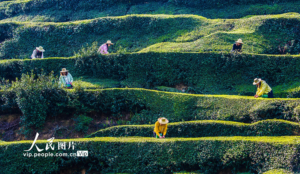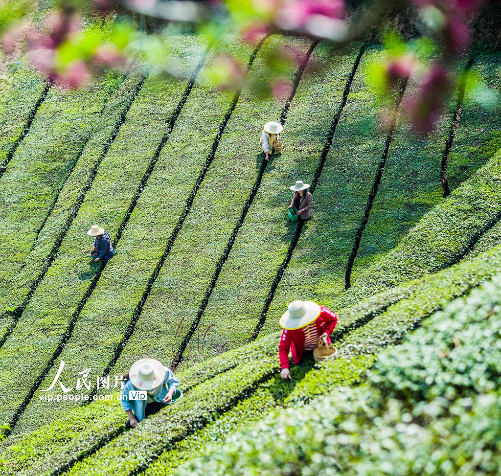 2025年4月8日,湖北黄冈英山县杨柳湾镇茶叶谷春茶迎来采摘季,茶农们正穿梭于生态茶园采摘嫩芽。赵广亮摄(人民图片网)