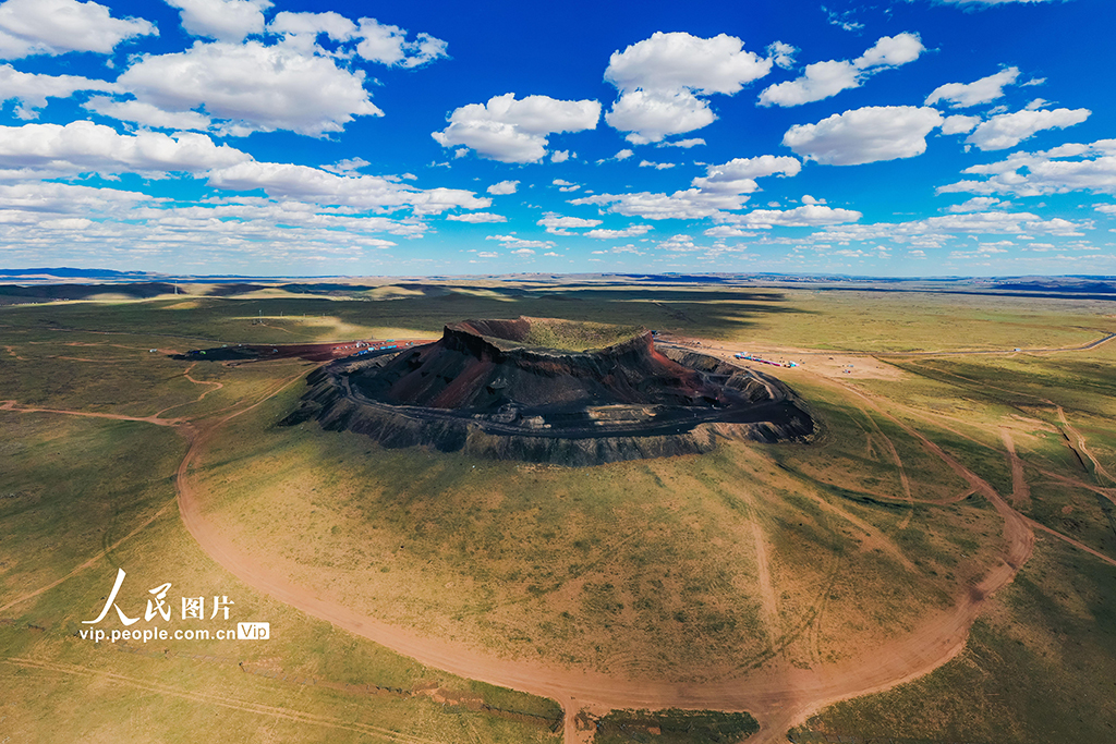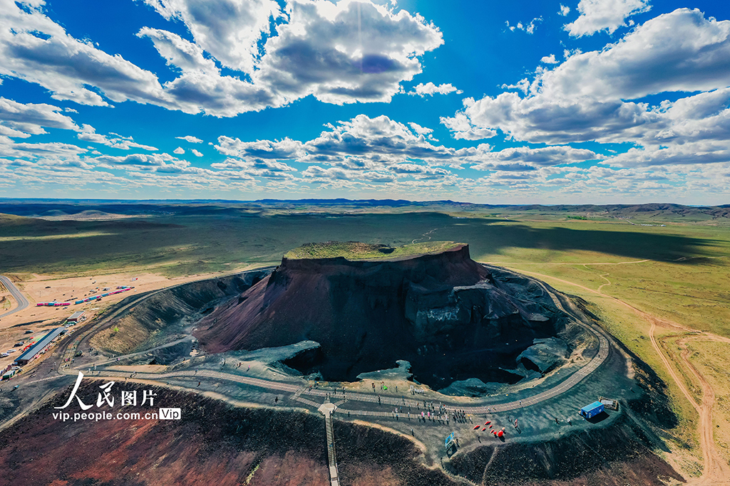 2025年5月14日,内蒙古自治区乌兰察布市察哈尔右翼后旗的乌兰哈达火山群与广袤草原相映成景。王晓博摄(人民图片网)