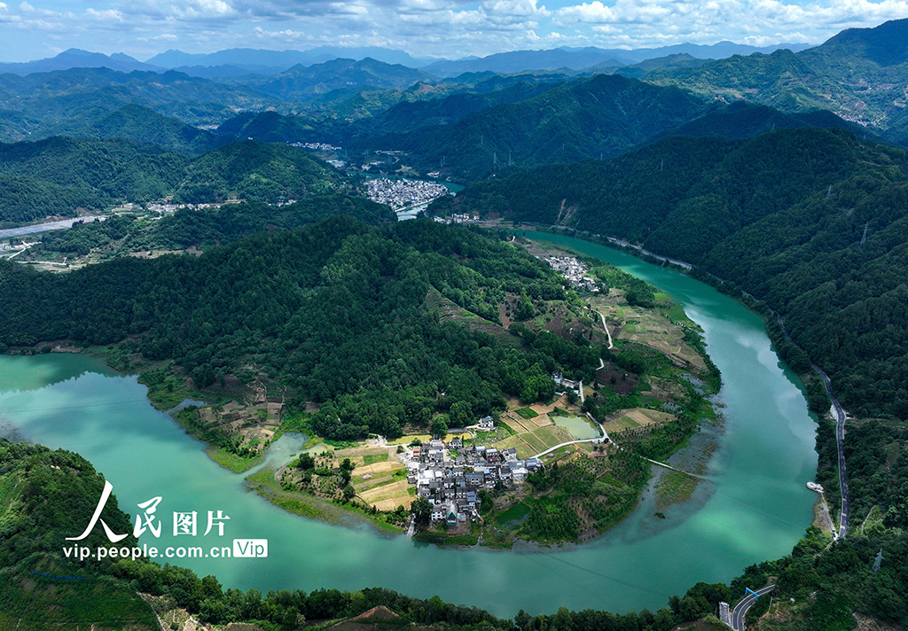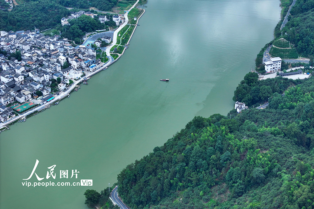 仲夏时节,安徽省黄山市歙县新安江畔风光旖旎。碧水萦绕青峦,粉墙黛瓦的村落错落分布,游人乘舟悠然穿行于江上,波光潋滟间,恍若步入一幅流动的山水长卷。施亚磊摄(人民图片网)