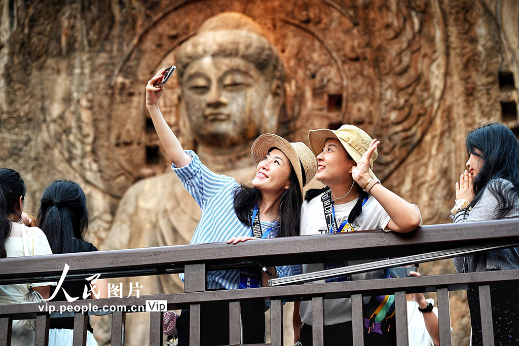 2025年6月18日,游客在夜色中游览河南省洛阳市龙门石窟,感受精美绝伦的石刻艺术,领略世界文化遗产的独特魅力。张光辉摄(人民图片网)
