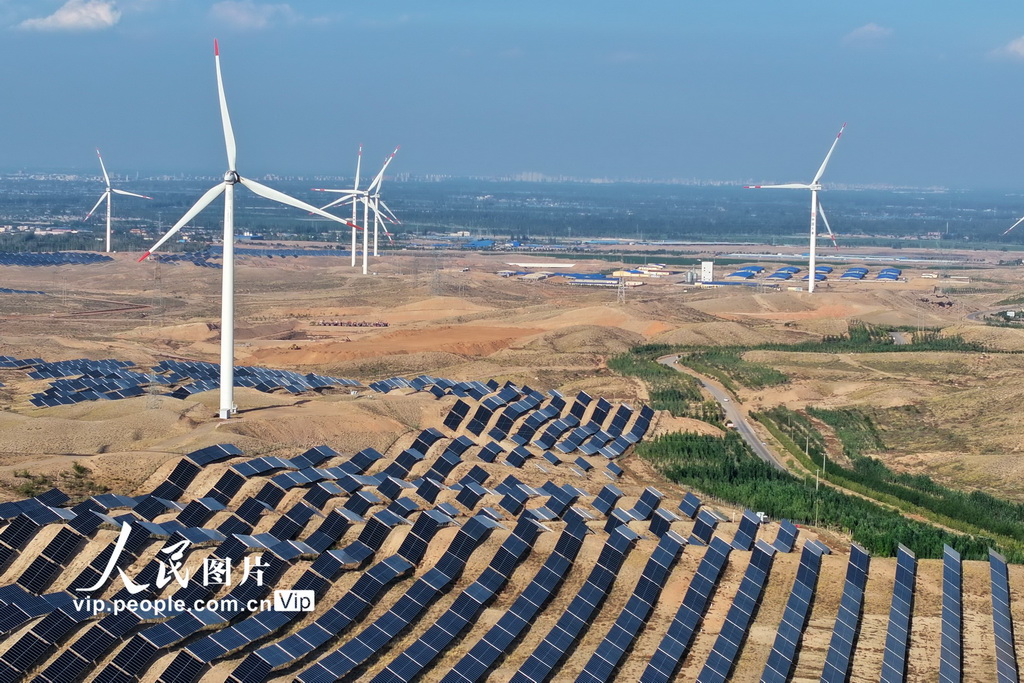 2025年6月28日,在宁夏回族自治区青铜峡市一处戈壁滩上的新能源基地,一座座风力机组与一块块光伏板相互映衬,源源不断地输送绿色能源。袁宏彦摄(人民图片网)