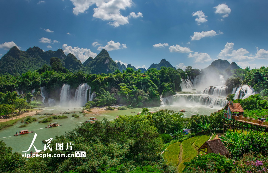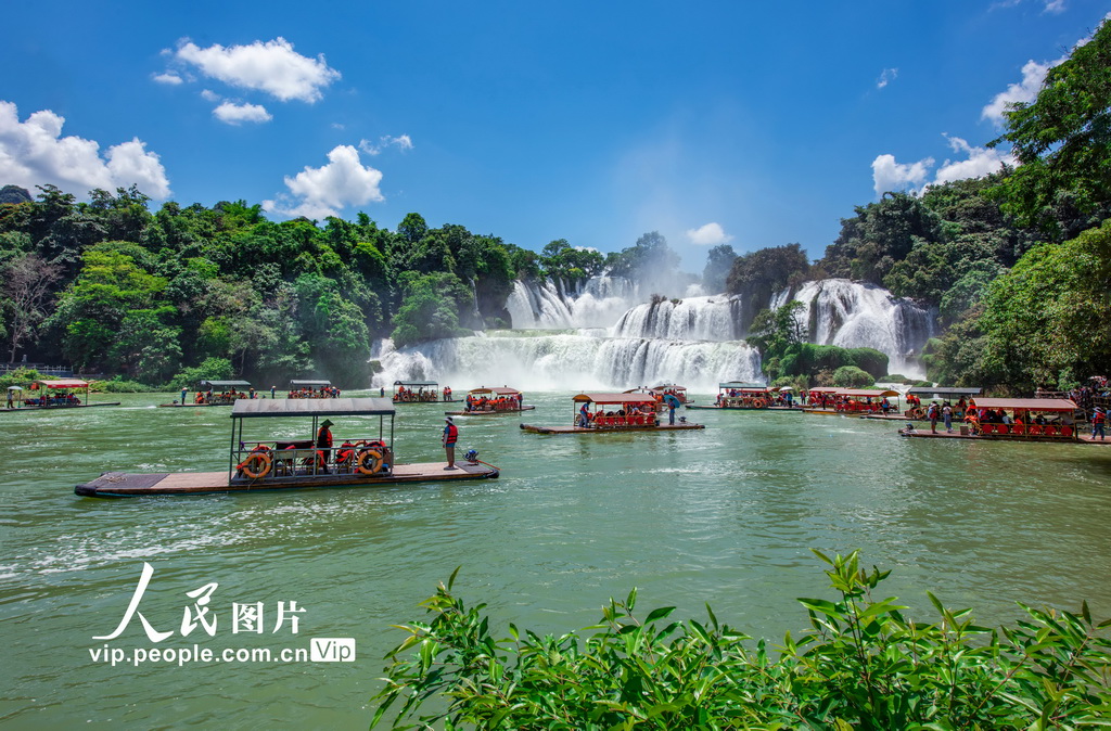 2025年7月26日,游客在广西崇左市大新县德天瀑布景区游玩。 德天瀑布位于广西崇左市大新县硕龙镇德天村中国与越南边境处的归春河上游,是亚洲第一、世界第四大跨国瀑布。随着夏季雨季的到来,德天瀑布进入了丰水期,浩浩荡荡的归春河水从山崖上跌宕而下,激起层层水花和白雾,气势磅礴,壮美如画,吸引了各地游客前来观赏。曾祥忠摄(人民图片网)