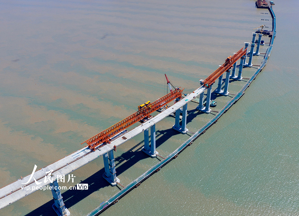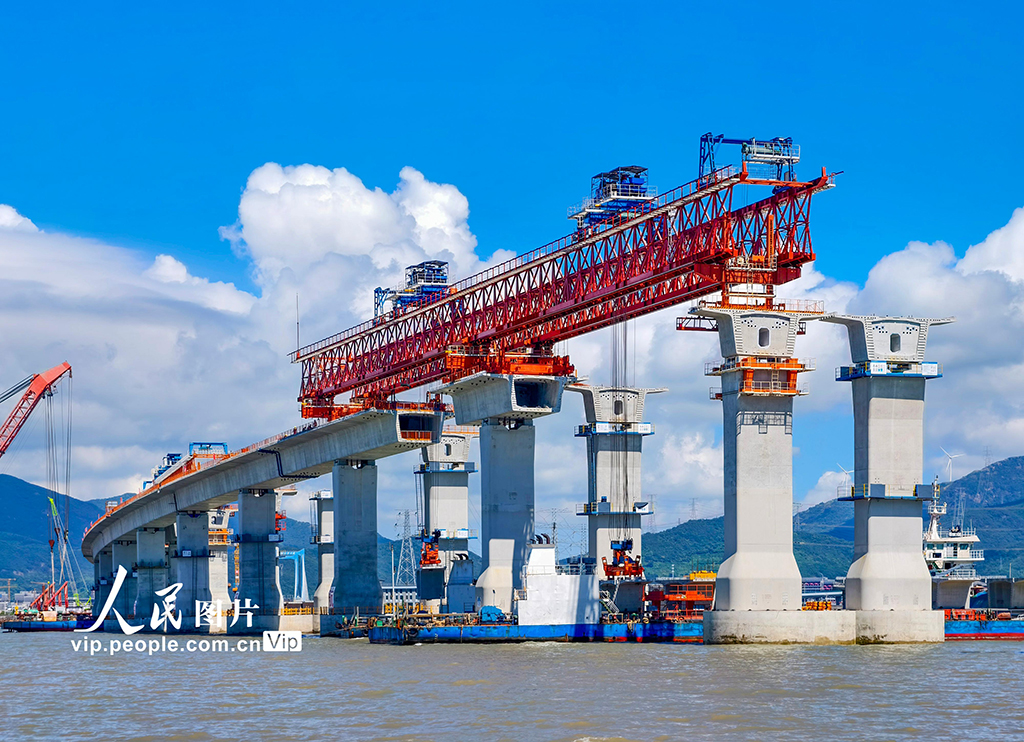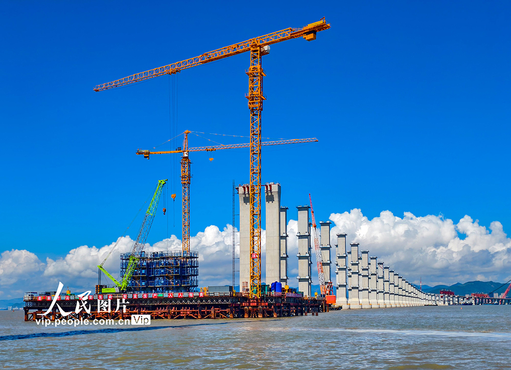 近日,浙江省六横公路大桥二期工程项目施工现场,中国铁建港航局的工人们采取错时作业方式,避开日中高温,奋战早晚,科学有序推进工程进度。胡学军摄(人民图片网)