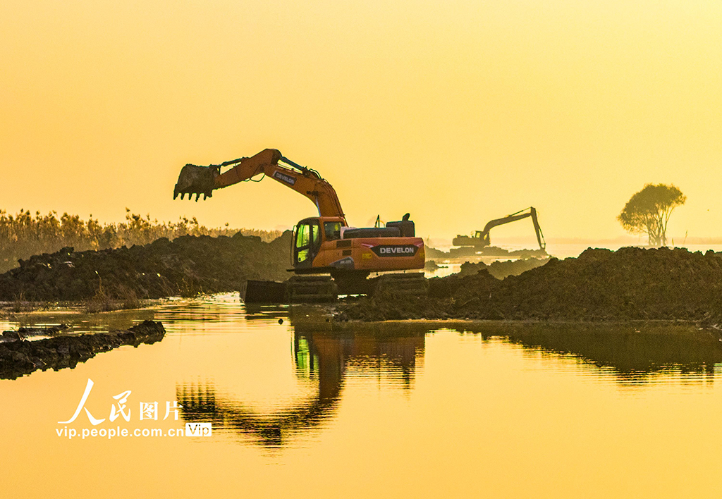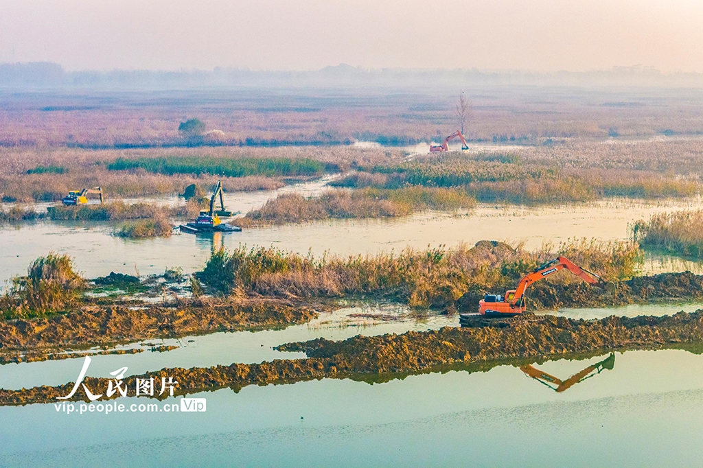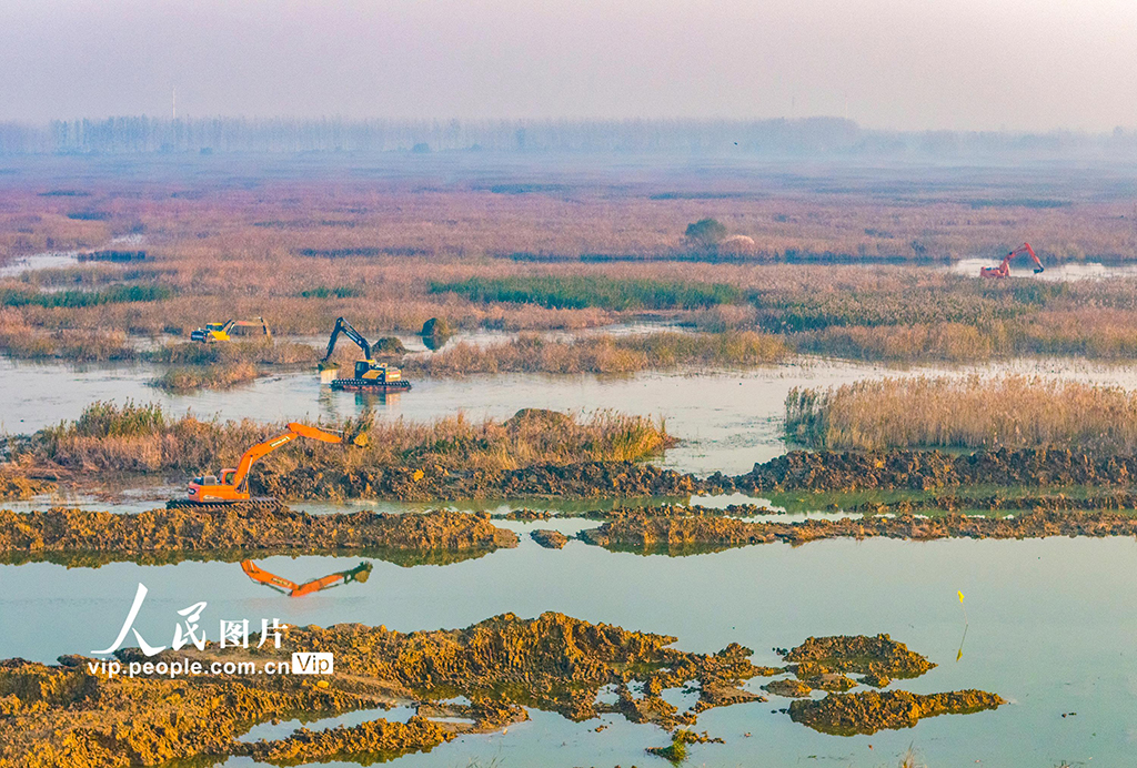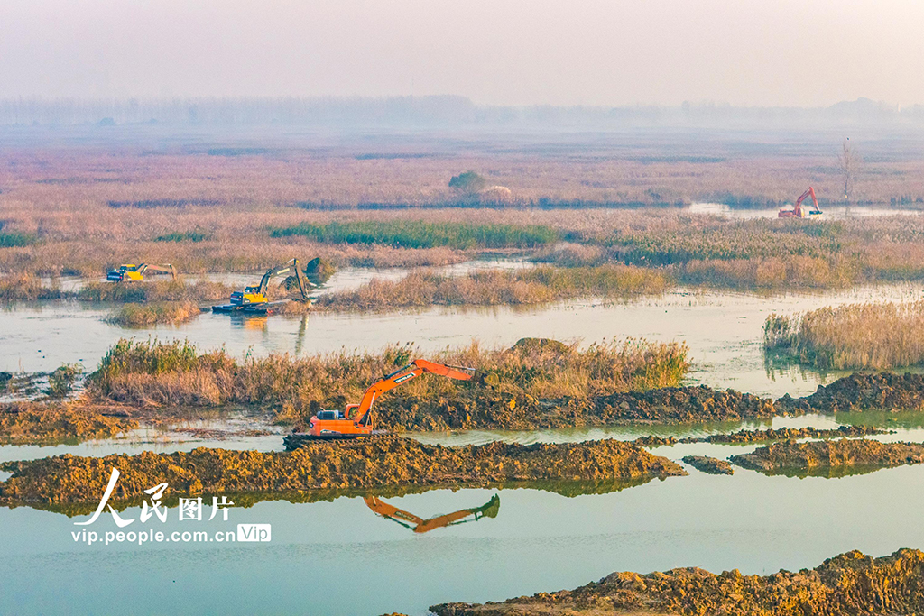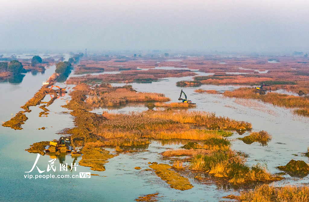 2025年11月21日,江苏省宿迁市泗洪洪泽湖湿地临淮段一片繁忙,多台挖掘机正开展水系疏浚与水生杂草清理作业,以改善水质、提升湿地生态功能。 作为国家重要湿地,泗洪洪泽湖湿地是候鸟迁徙的关键节点。此次作业是当地退渔还湿、生态修复工程的延续。通过科学治理,湿地水质已从IV类提升至III类,鸟类种类增至240种。持续的生态保护使湿地成为“天然氧吧”,为绿色发展奠定坚实基础。张连华摄(人民图片网)