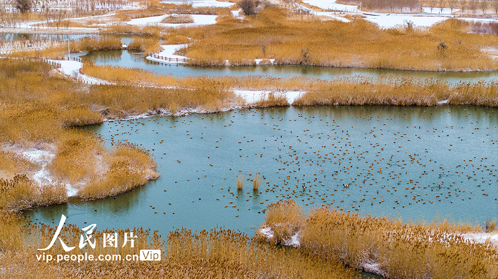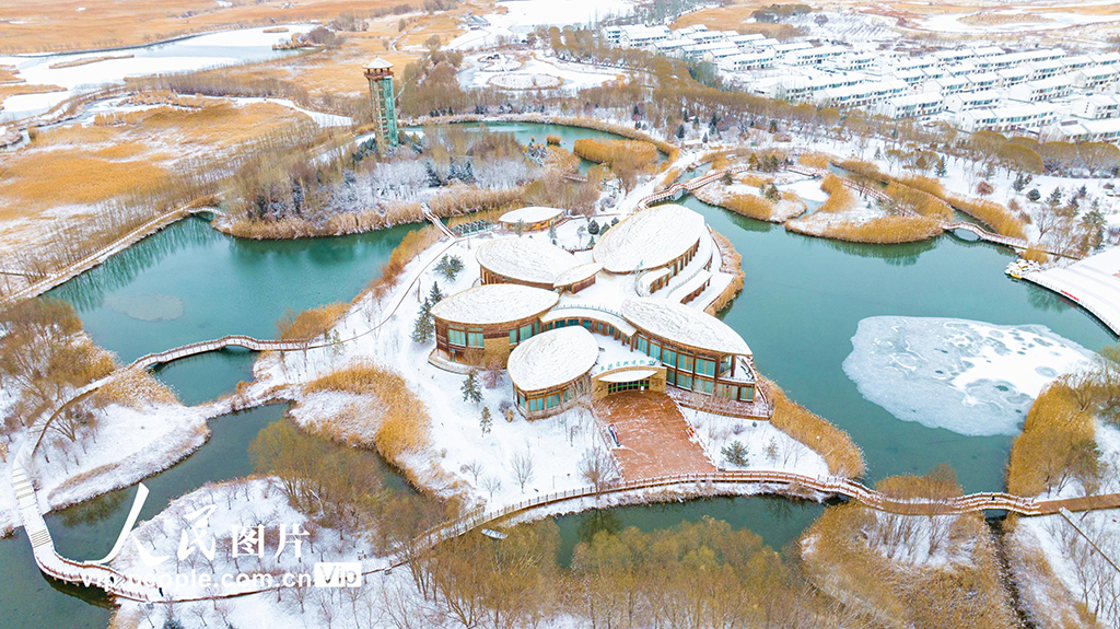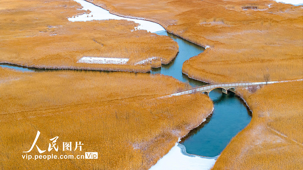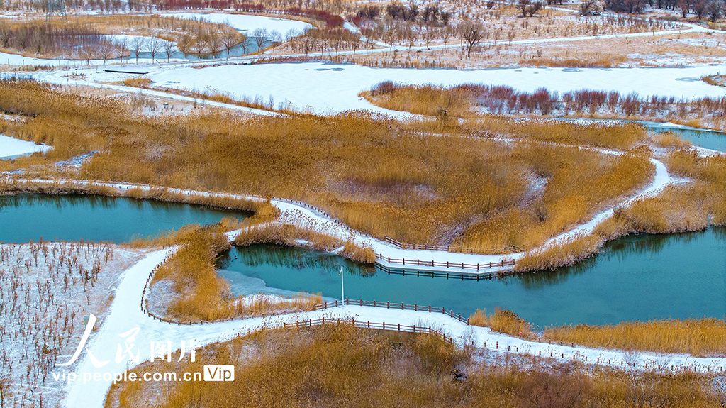 2025年12月12日,雪后的甘肃张掖国家湿地公园,碧水、白雪、金黄的芦苇与蜿蜒的步道、河流、亭台相映成景,构成一幅幅美丽的生态画卷。杨永伟摄(人民图片网)