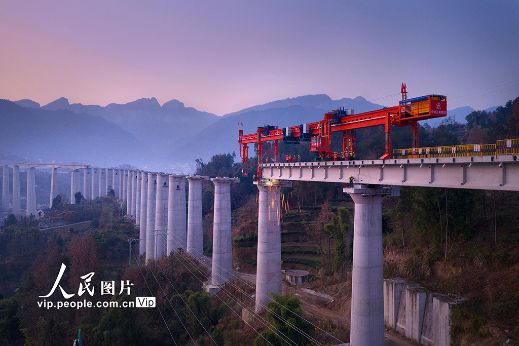2025年12月26日,三峡库区湖北省宜昌市秭归县,三峡枢纽茅坪港疏港铁路九里特大桥T型梁架设工地一派繁忙。 三峡枢纽茅坪港疏港铁路自宜万铁路宜昌南站西端引出,止于秭归县茅坪港,线路全长39.59公里,按国铁Ⅲ级铁路标准建设。该铁路建成后,将与三峡翻坝江南高速公路、三峡翻坝江北高速公路一起,共同构建长江三峡水路、公路、铁路的“多式联运”交通运输体系,从而加强三峡翻坝水陆转运、减轻三峡船闸通航负荷。郑坤摄(人民图片网)