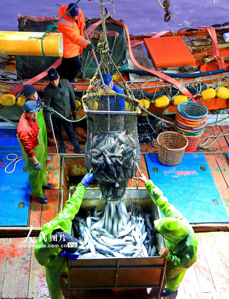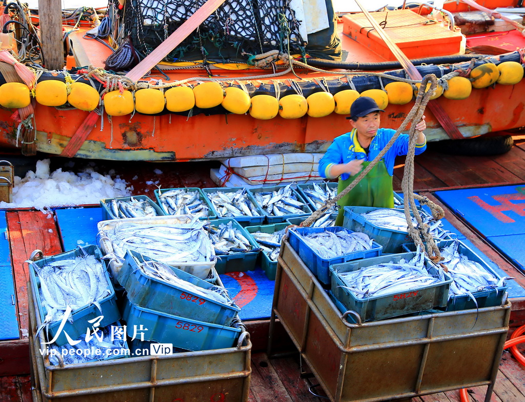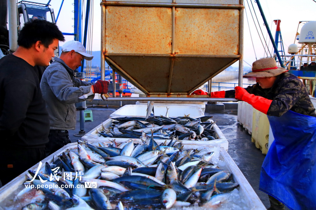 2026年1月10日,捕捞归来的渔船陆续停靠在浙江省玉环市大麦屿渔港码头,渔民们正忙着将大量渔获卸载分拣、保鲜运送。段俊利摄(人民图片网)
