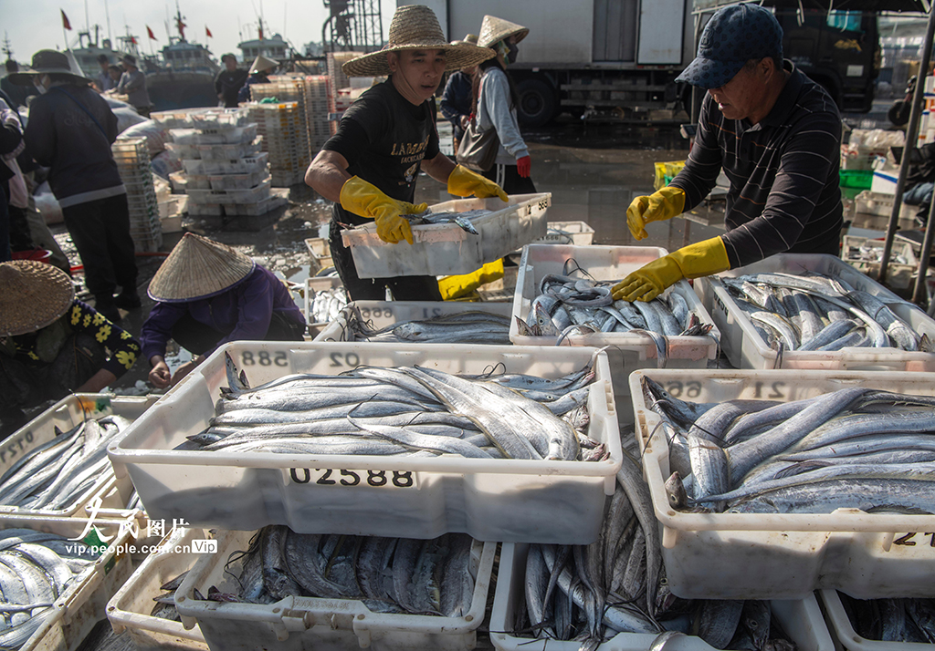新年伊始,海南持续迎来风和日丽的好天气。在文昌清澜港,满载而归的渔船陆续抵港,渔获被不断运上码头。渔民们利落地分拣、搬运,一筐筐新鲜的带鱼、马鲛鱼及虾蟹贝类被迅速转运上岸。蒙钟德摄(人民图片网)
