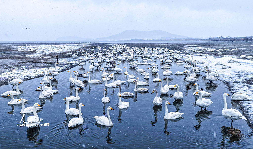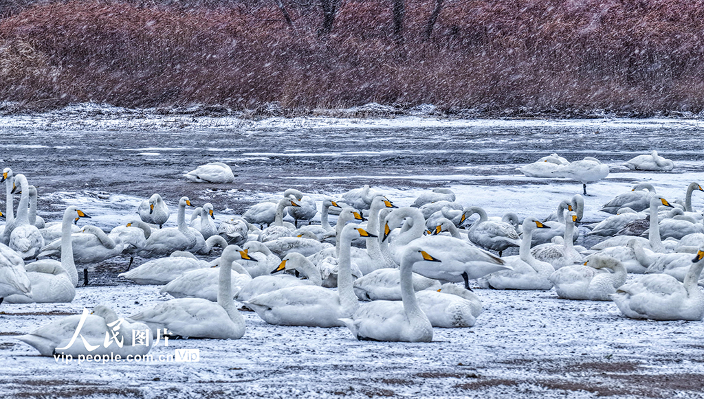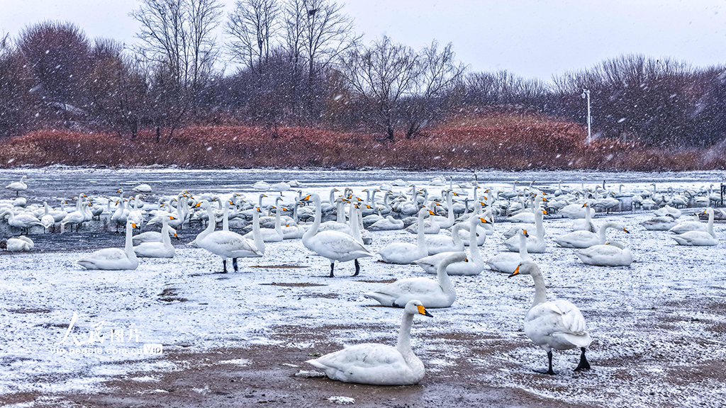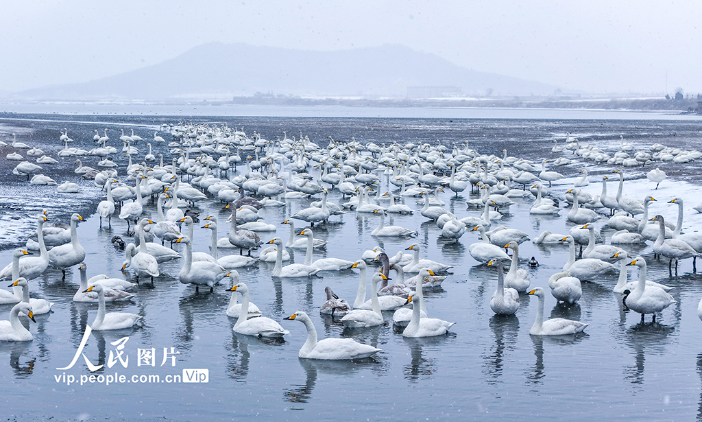 2026年1月18日,山东荣成大天鹅国家级自然保护区天鹅湖,成群的越冬大天鹅在雪中栖息、觅食。李信君摄(人民图片网)