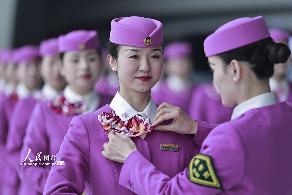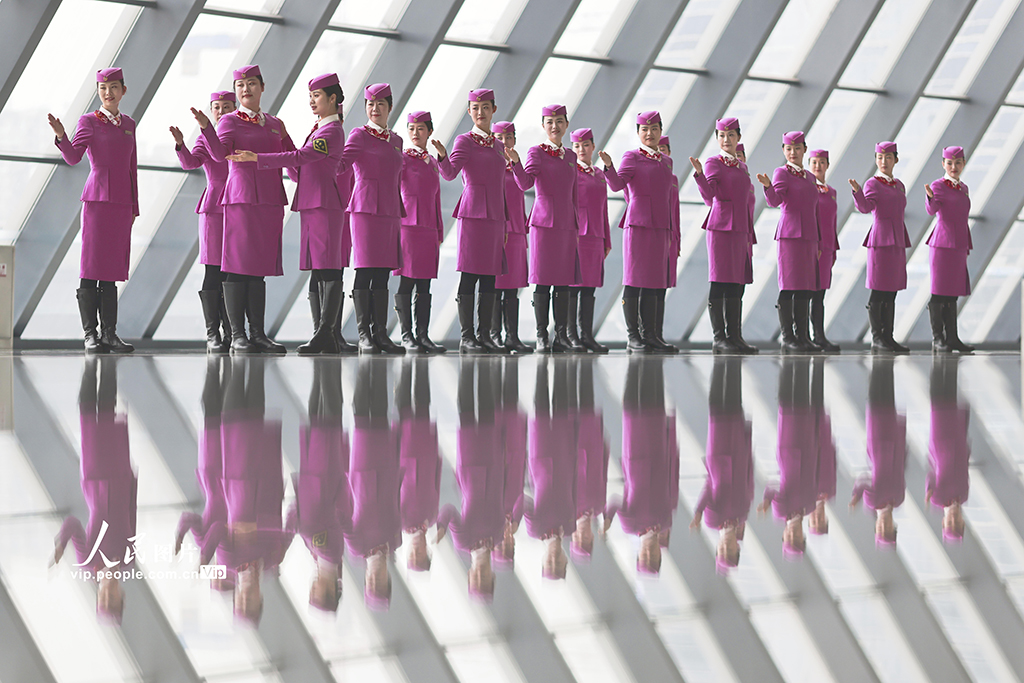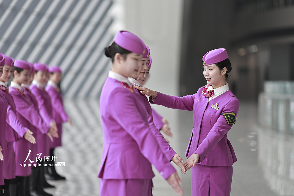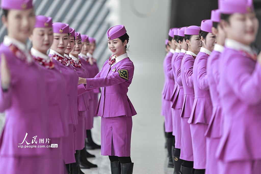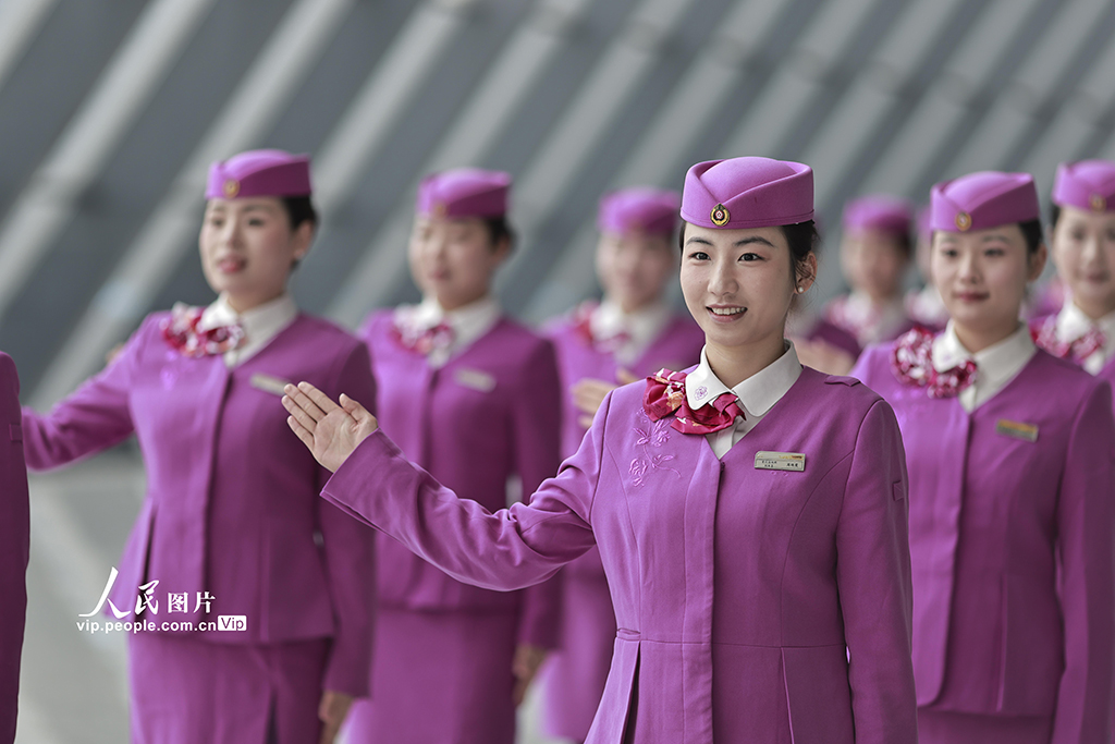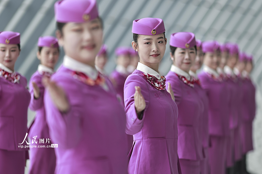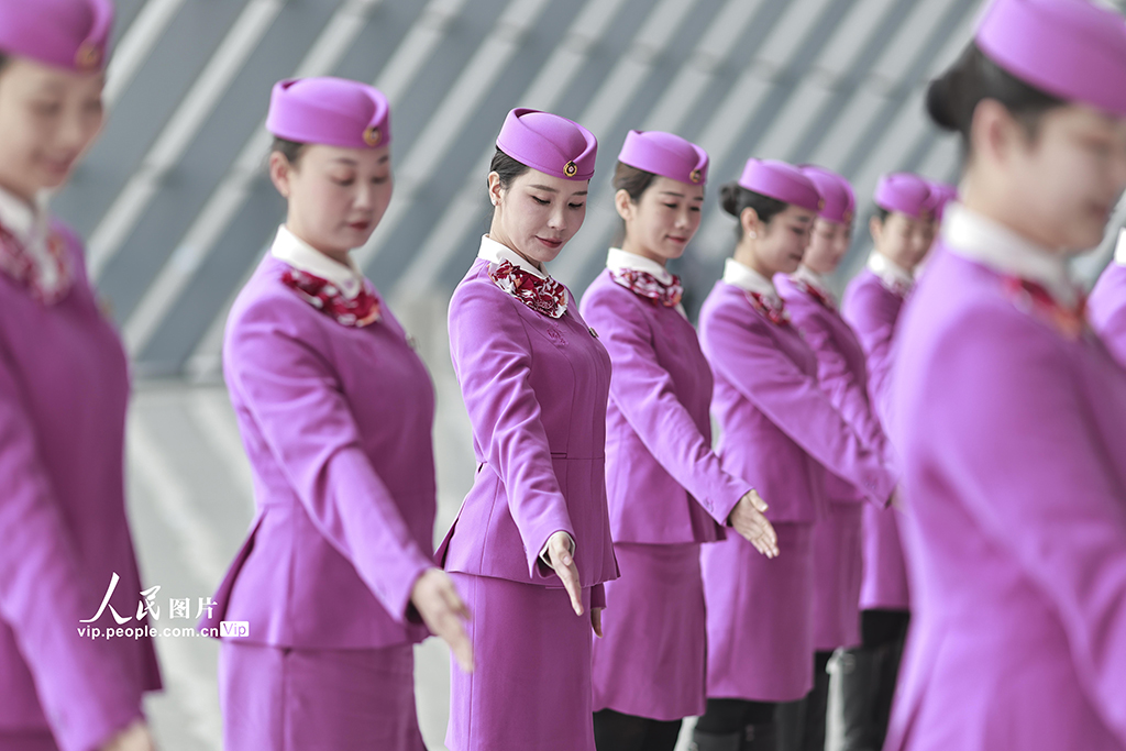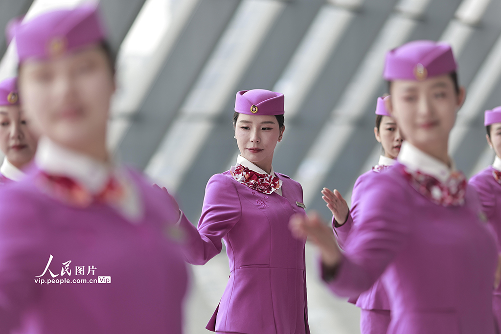 2026年春运临近,中国铁路成都局集团有限公司重庆客运段组织高铁乘务员开展形体仪态、妆容礼仪等方面的集中培训,提升服务技能,为春运工作做好准备。苏志刚摄(人民图片网)