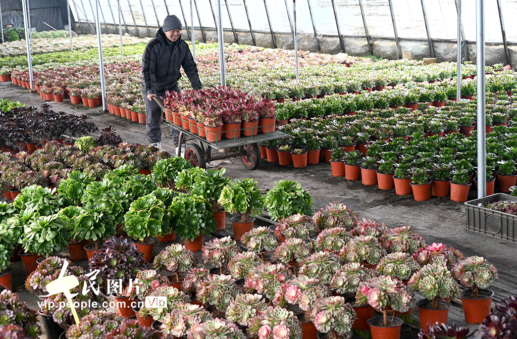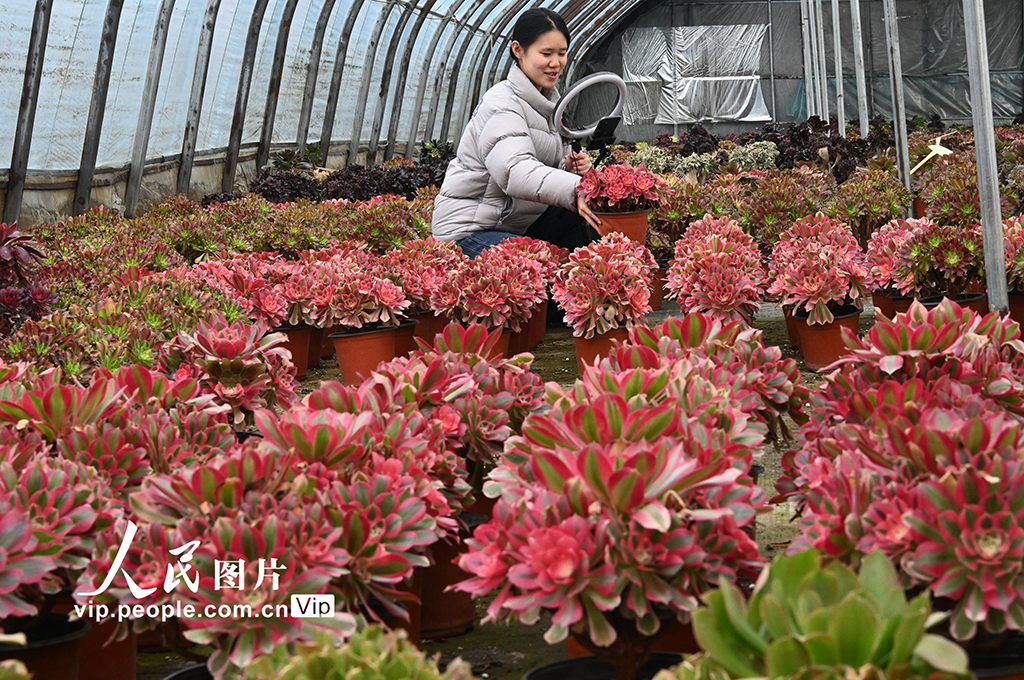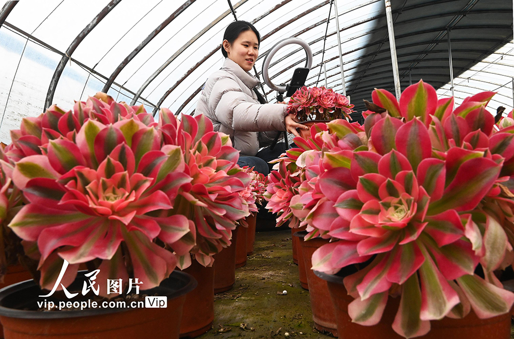 2026年1月26日,河北邯郸峰峰矿区彭城镇河泉村村民通过网络直播,推介销售多肉植物。这些特色绿植既丰富了年宵花市场,也为村民拓宽了增收渠道。郝群英摄(人民图片网)
