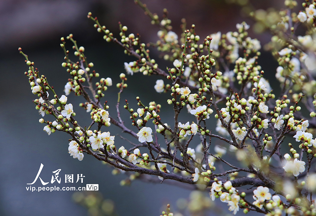 2026年1月27日,江苏苏州古典园林拙政园内一株株早春红梅、绿梅及粉白色梅花含苞欲放,争奇斗艳。王建中摄(人民图片网)