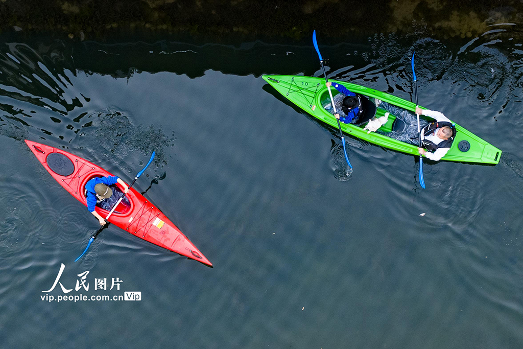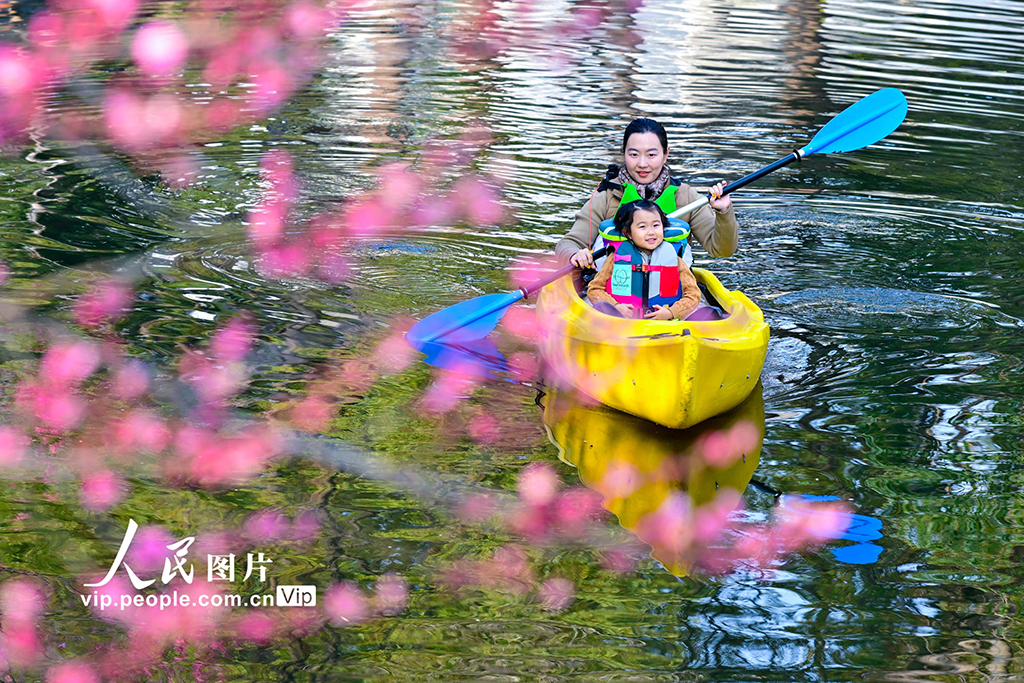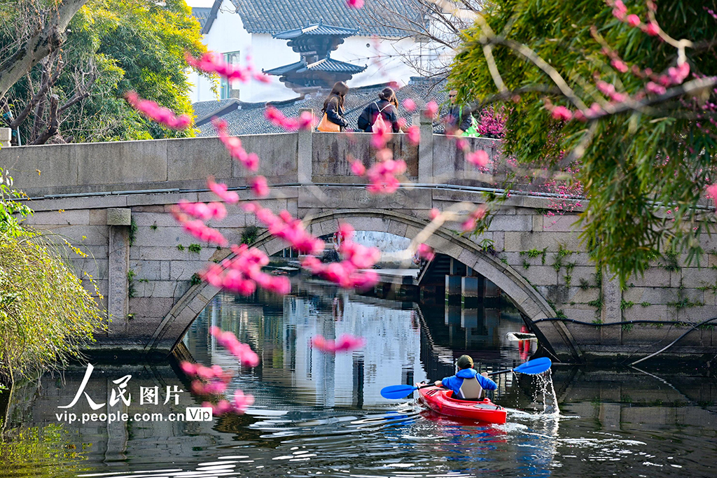 2026年2月12日,江苏省昆山市千灯镇歇马桥古村迎来春日限定美景,粉嫩梅花竞相绽放,点缀古桥流水与白墙黛瓦,绘就一幅江南春日画卷。皮划艇爱好者们穿梭于古村河道,桨声轻击水面,与岸边早开的梅花相映成趣。袁新宇摄(人民图片网)