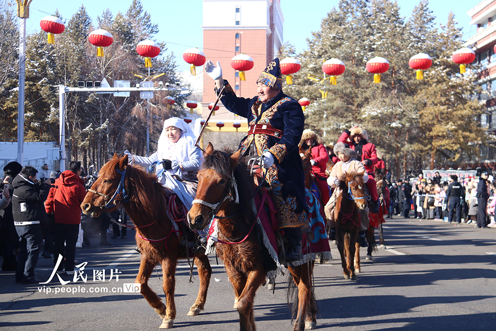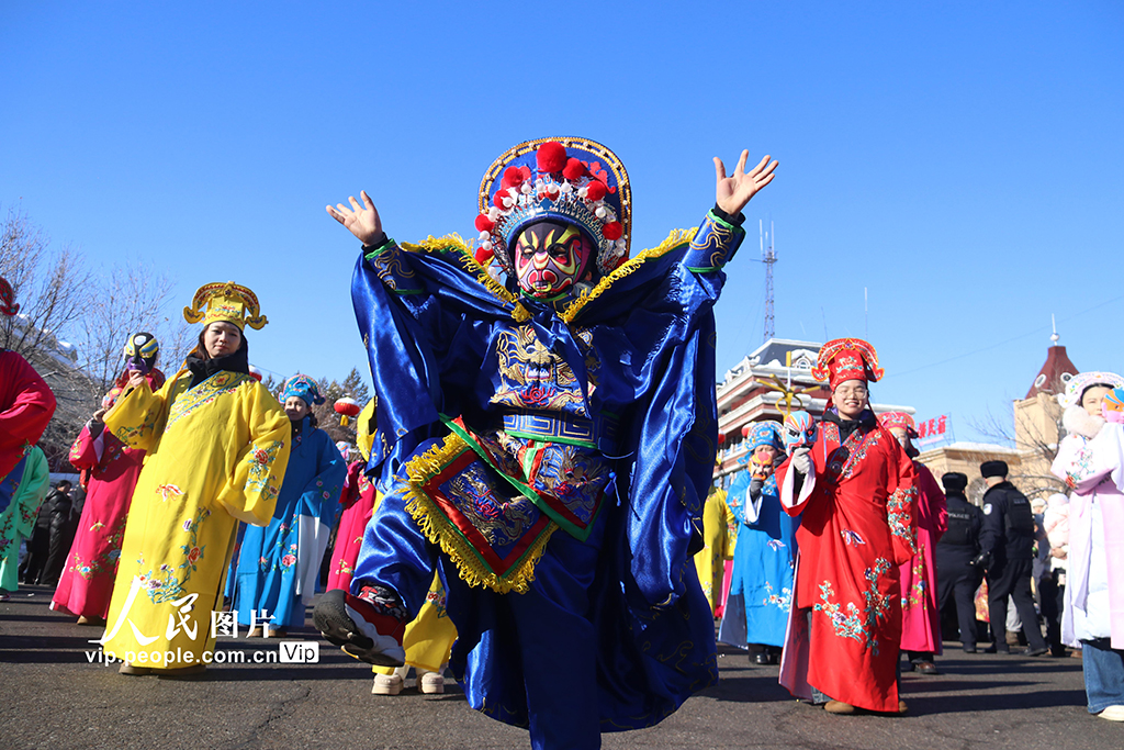 2026年2月14日,新疆阿勒泰市“雪都阿勒泰·社火迎新春”表演活动火热开场。汉服展示、国粹脸谱、古老毛皮滑雪等17支特色方队相继登场,将传统民俗与阿勒泰地域风情相融合,以喜庆欢腾的表演为各族群众送上新春祝福,营造出欢乐祥和、团结奋进的节日氛围。唐晓波摄(人民图片网)