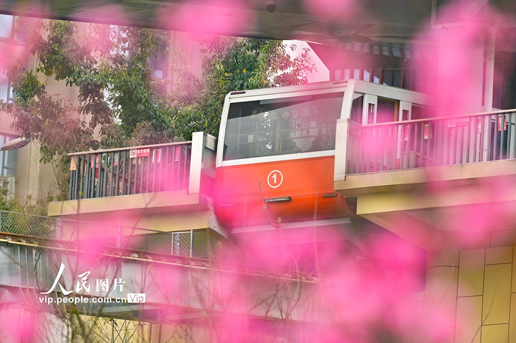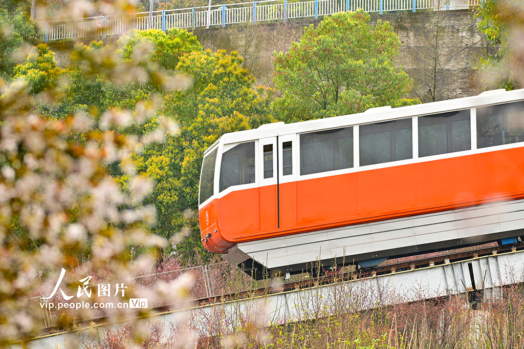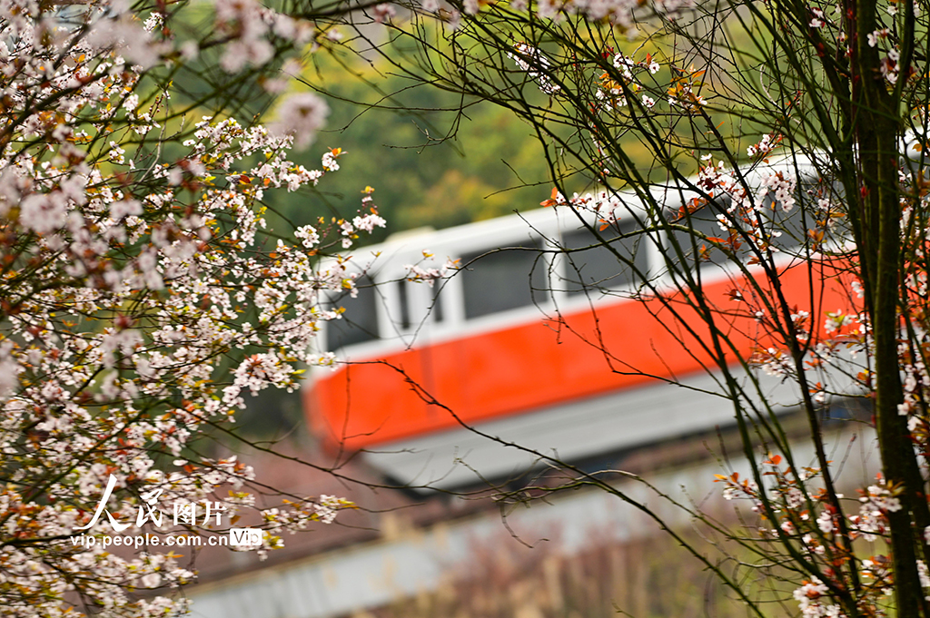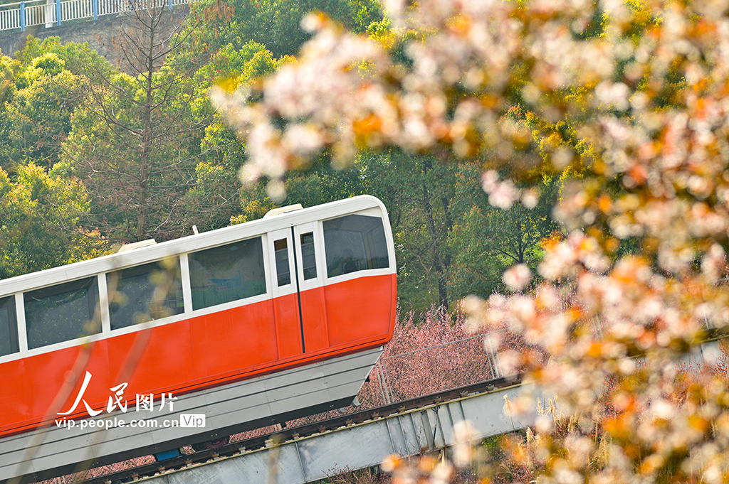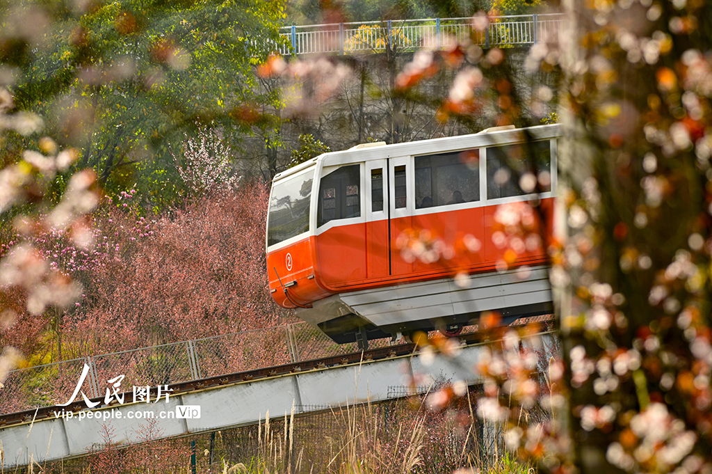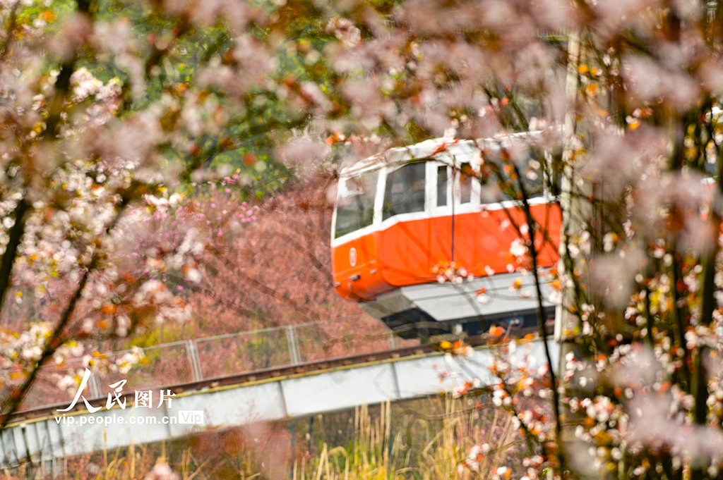 2026年3月4日,在重庆两江新区礼嘉智慧公园,时光缆车穿行于繁花之间,与花海相映成趣,尽显春日生机。徐春茂摄(人民图片网)