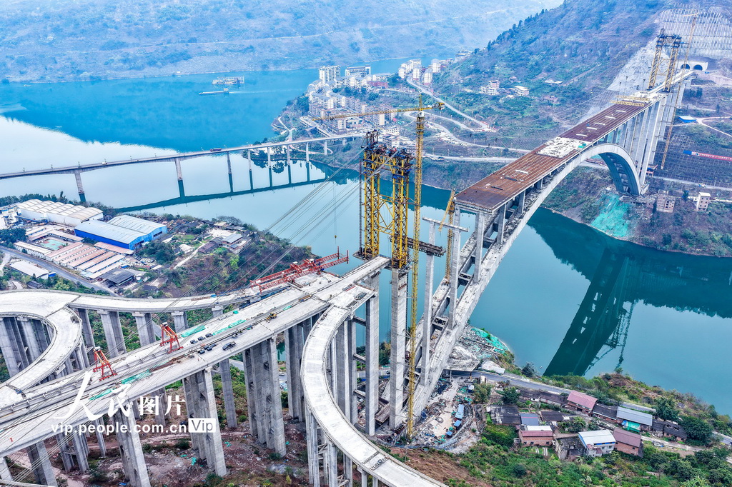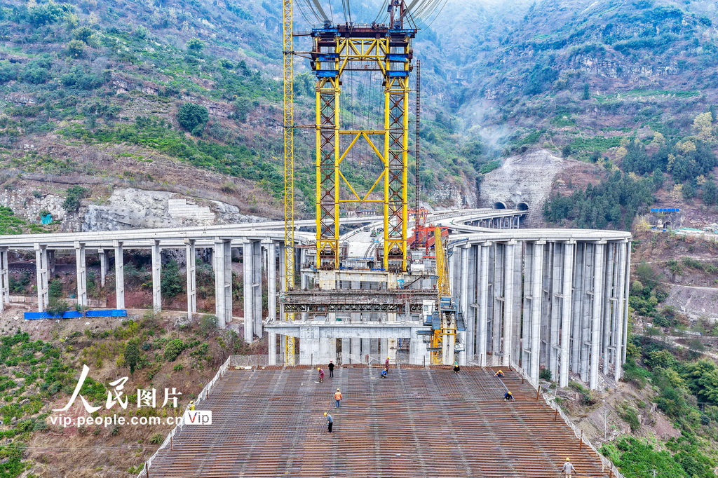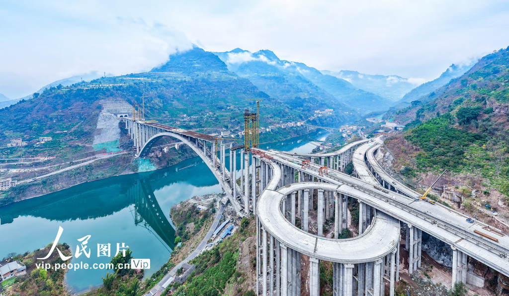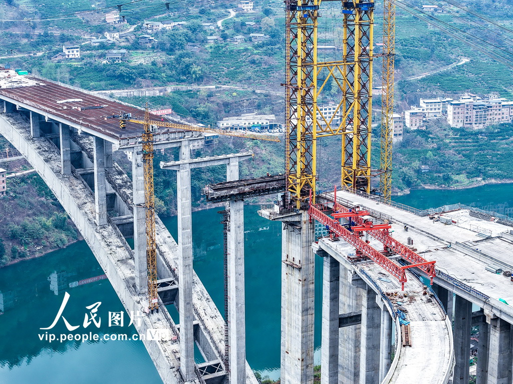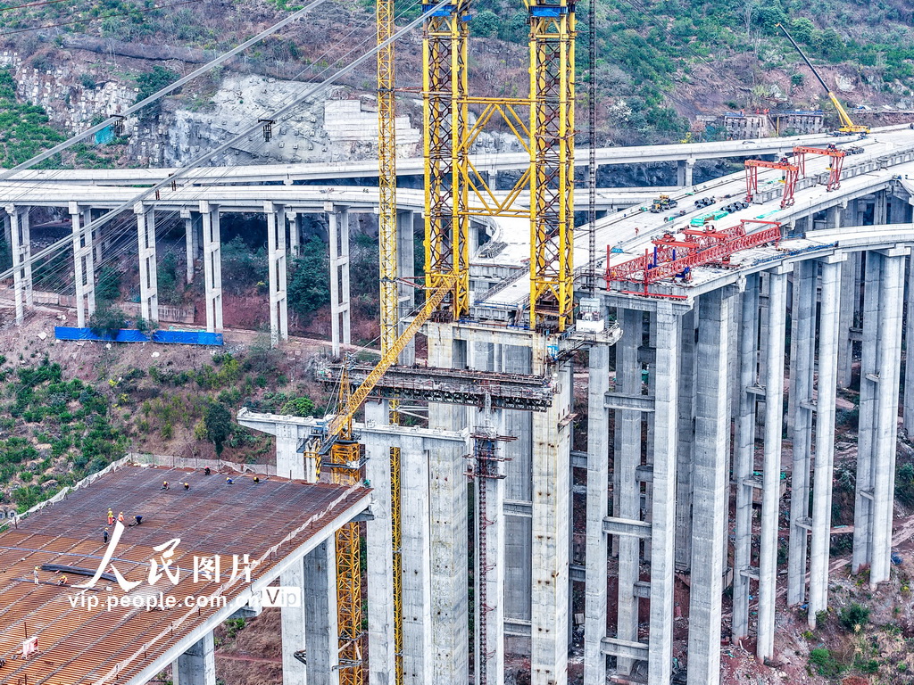 2026年3月6日,四川省宜宾市屏山县,宜攀高速西宁河特大桥建设正酣。西宁河特大桥全长698米,是宜攀高速连接仁沐新高速的关键控制性工程与枢纽节点。张元戎摄(人民图片网)