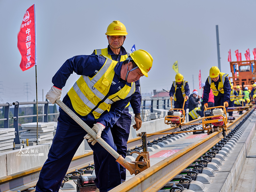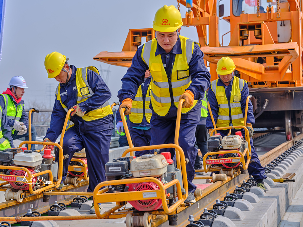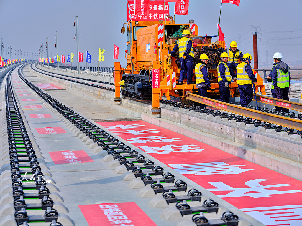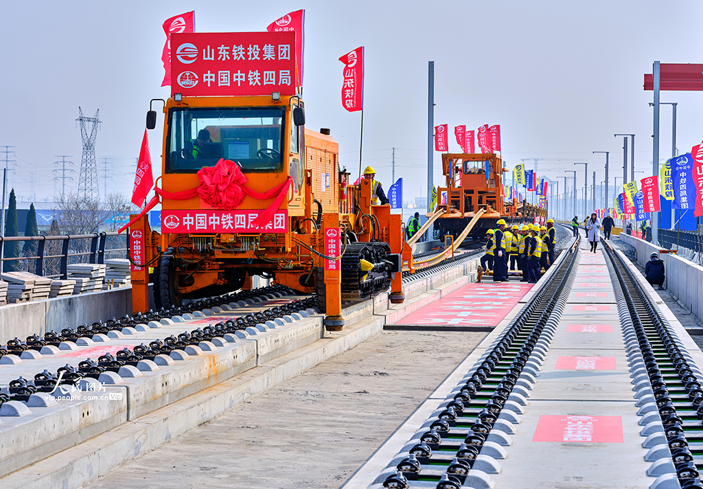 2026年3月10日上午,在山东滨州济滨高铁建设现场,首对500米长钢轨被平稳、精准地铺设于惠滨2号特大桥无砟道床,标志着济滨高铁正式进入铺轨阶段。 济滨高铁是津潍高铁及山东省鲁北快速铁路通道的重要组成部分,也是国家“八纵八横”高铁网京沪、青太通道的关键联络线。全线设济南东、遥墙机场、济阳、商河、惠民、滨州6座车站。史家民摄(人民图片网)