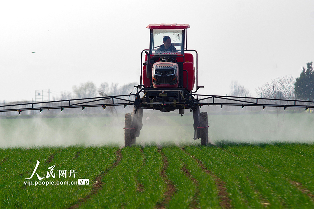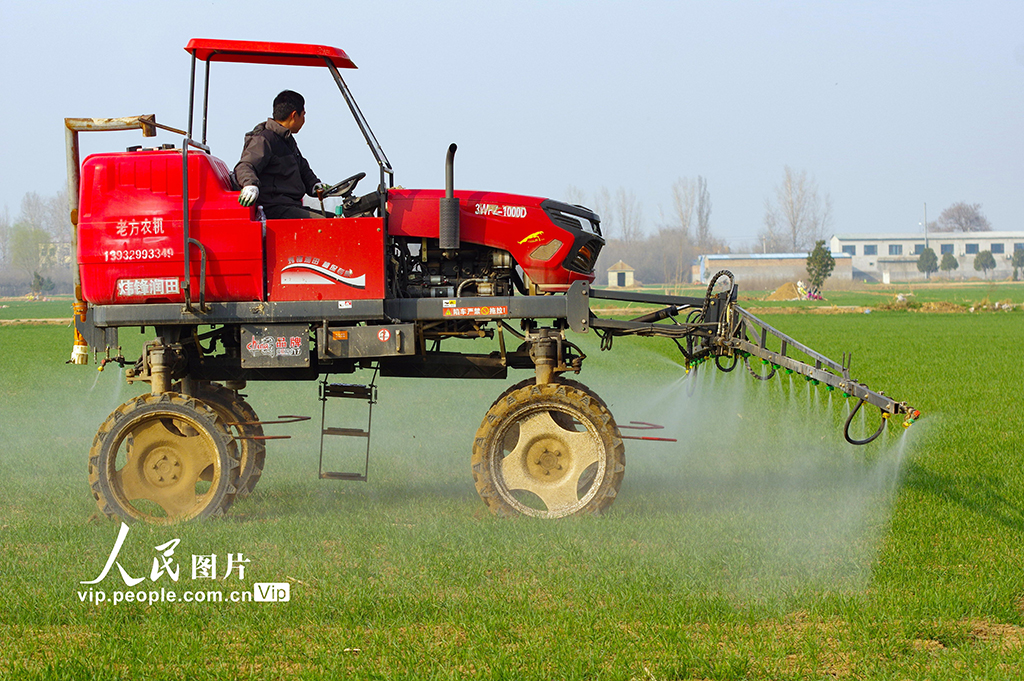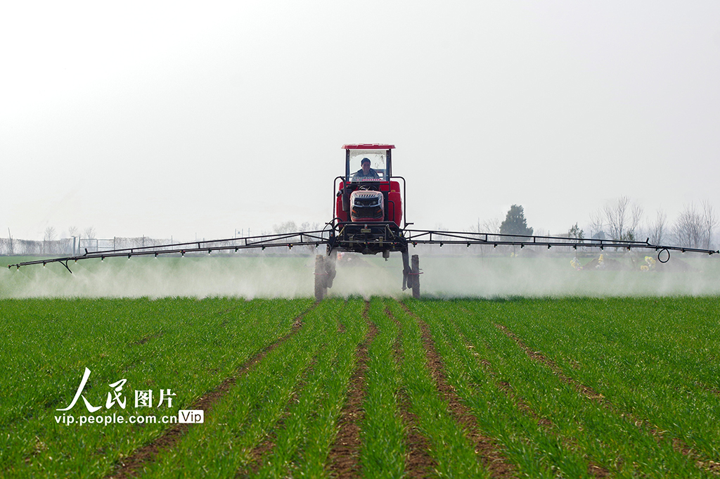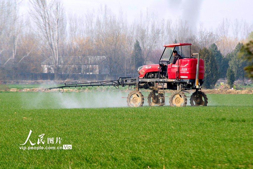 2026年3月12日,河北邯郸鸡泽县,农民抢抓农时,开展春季小麦田间管理,有针对性地进行叶面喷施和植保防病等作业。金书怀摄(人民图片网)
