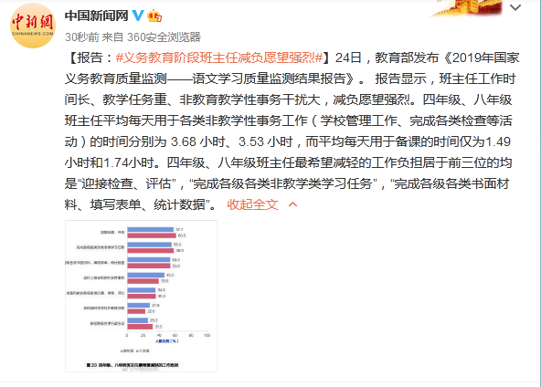 【报告:#义务教育阶段班主任减负愿望强烈#】24日,教育部发布《2019年国家义务教育质量监测——语文学习质量监测结果报告》。