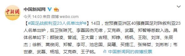 【#国足战叙利亚23人名单出炉#】14日,世预赛亚洲区40强赛国足对阵叙利亚23人名单出炉,后卫张琳芃、李磊因伤无缘,艾克森、武磊、郑智等悉数入选。具体名单如下:颜骏凌、曾诚、王大雷;吉翔、郑铮、杨帆、王刚、刘洋、朱辰杰;徐新、蒿俊闵、郑智、李可、池忠国、吴曦、买提江、张稀哲、刘彬彬;韦世豪、武磊、杨旭、艾克森、王子铭。