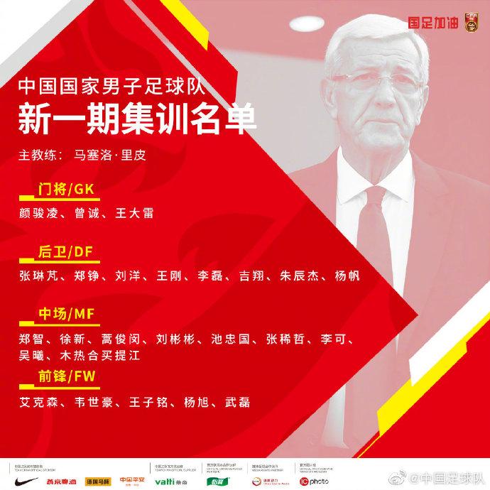 最新一期国足集训名单。图片来源:中国足球队官方微博