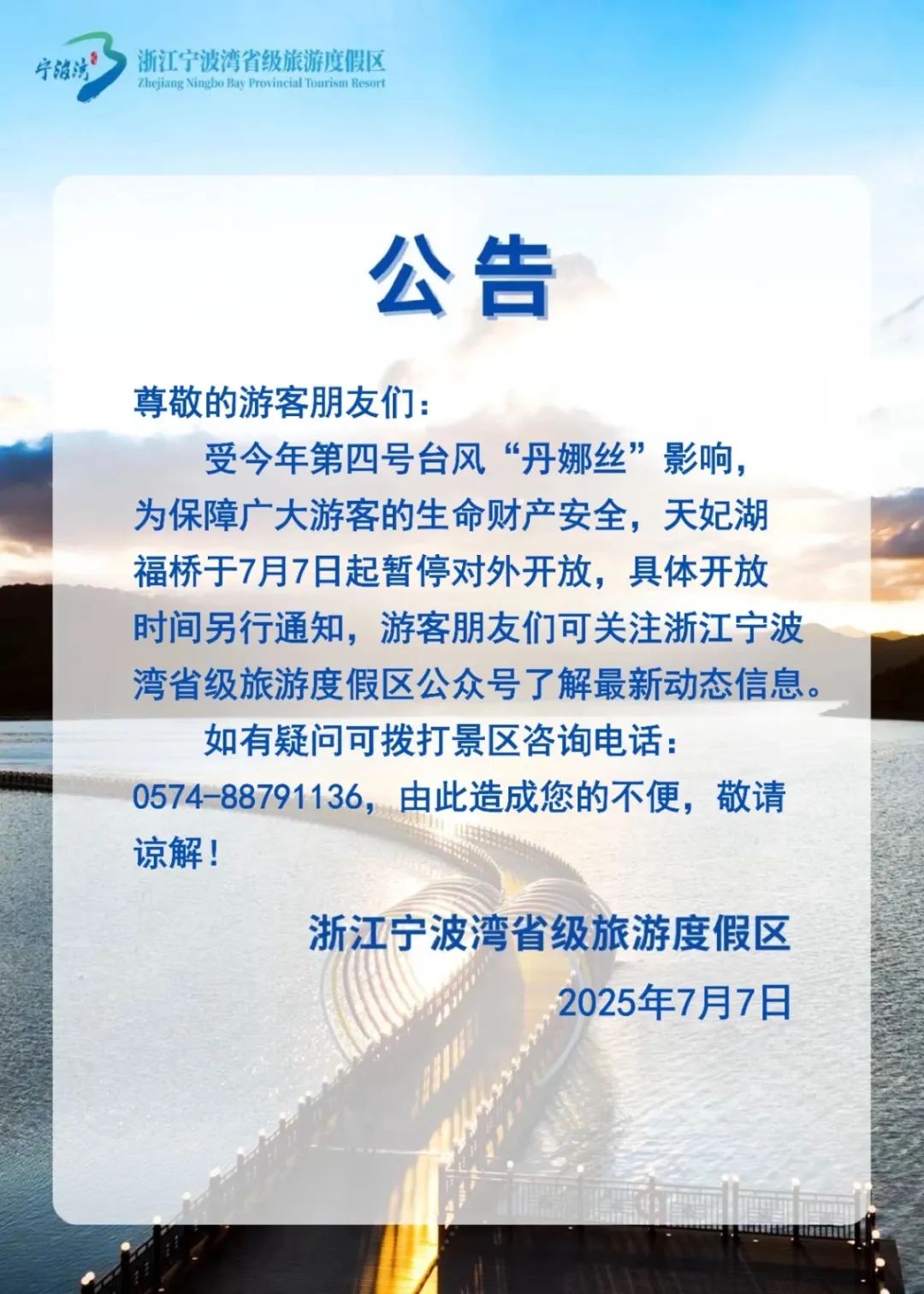 其中,天妃湖福桥于7月7日起暂停对外开放;强蛟镇横山岛景区于7月6日18时起暂停对外开放,休闲渔船回港避风停止运营;象山花岙石林景区也是暂时闭园状态。具体开放时间另行通知。