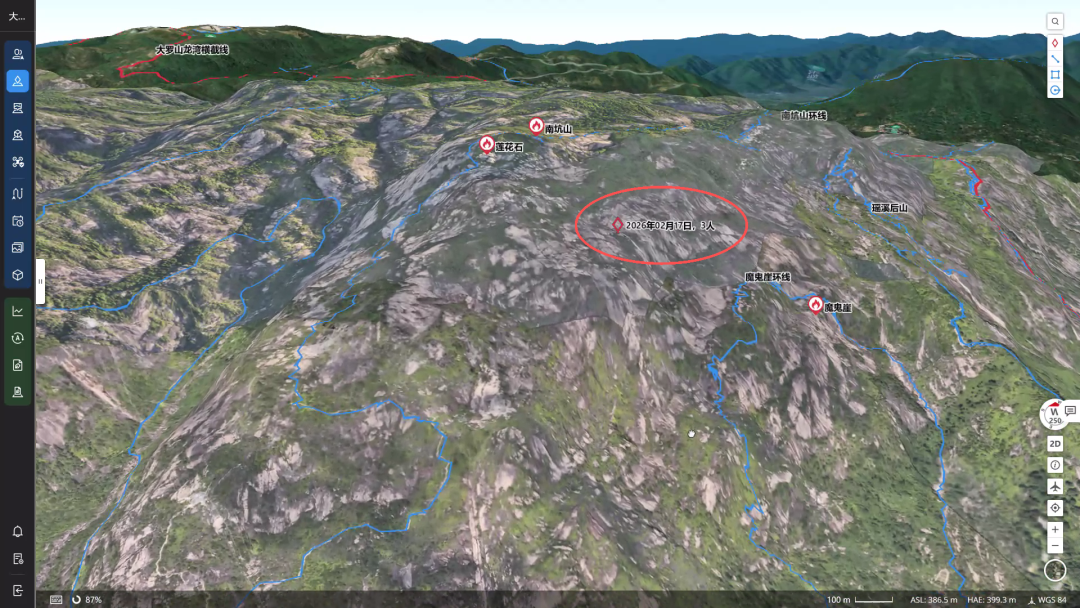 17时40分许,特警救援队员到双岙水库,同赶来的消防救援人员进行了简短研判。根据获取的卫星坐标,救援人员迅速调取大罗山三维建模数据,结合地形特征研判,发现被困位置附近有一条明显的深沟,为空中搜索提供了有利条件,缩小了无人机搜寻范围。