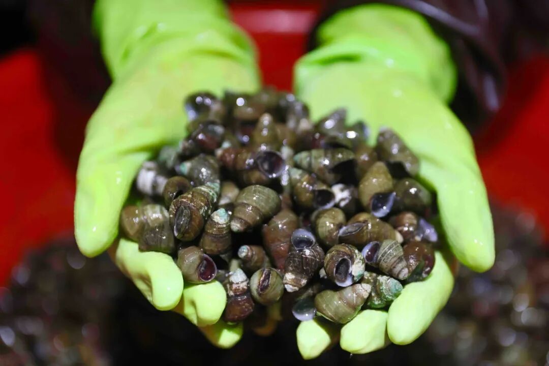另一边,经营户项师傅正按规格分拣螺蛳。只见一颗颗青壳薄皮的螺蛳泡在水中,泛着清亮的光泽。