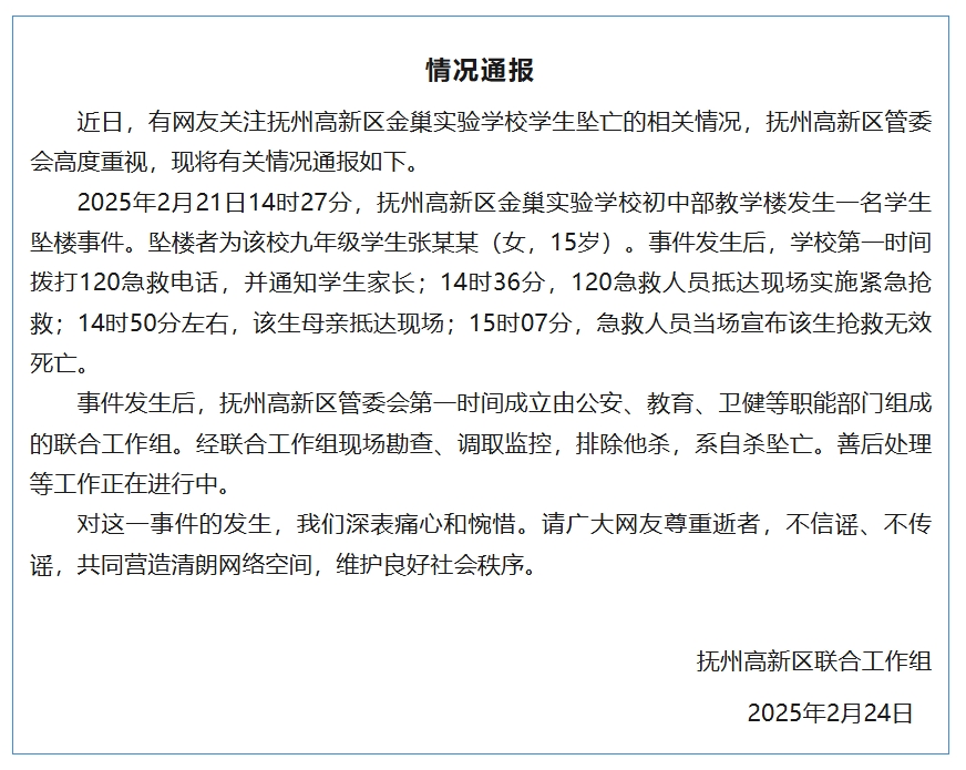 2025年2月21日14时27分,抚州高新区金巢实验学校初中部教学楼发生一名学生坠楼事件。坠楼者为该校九年级学生张某某(女,15岁)。事件发生后,学校第一时间拨打120急救电话,并通知学生家长;14时36分,120急救人员抵达现场实施紧急抢救;14时50分左右,该生母亲抵达现场;15时07分,急救人员当场宣布该生抢救无效死亡。