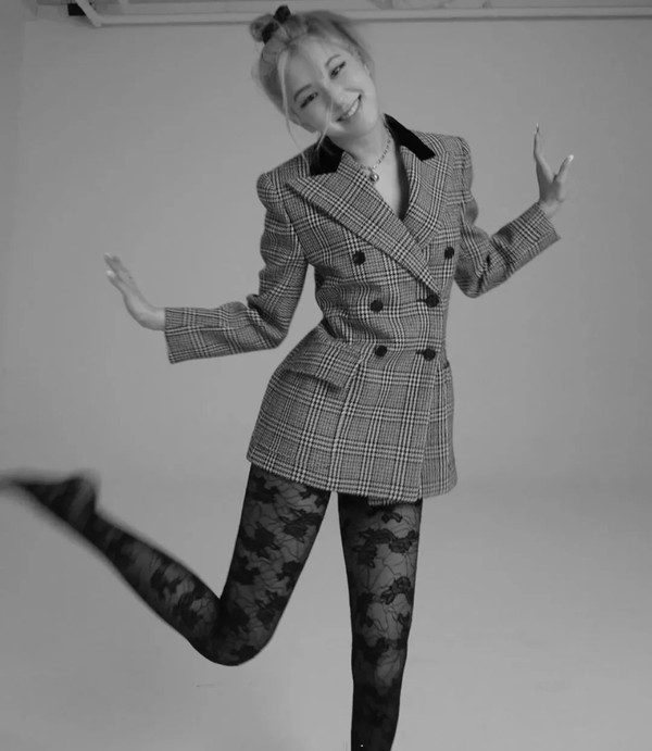 丝袜搭配浅色格纹西装,系个腰带“叛逆”又性感,仿佛伦敦街头的少女。