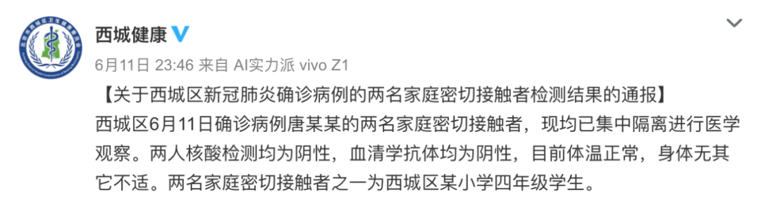 据@西城健康 消息,北京新增1例确诊病例的两名家庭密切接触者,现均已集中隔离进行医学观察。两人核酸检测均为阴性,血清学抗体均为阴性,目前体温正常,身体无其他不适。两名家庭密切接触者之一为西城区某小学四年级学生。