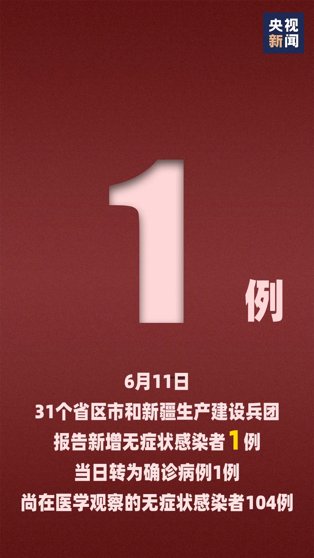 31个省(自治区、直辖市)和新疆生产建设兵团报告新增无症状感染者1例(为境外输入); 当日转为确诊病例1例(为境外输入);当日解除医学观察25例(无境外输入);尚在医学观察无症状感染者104例(境外输入45例)。