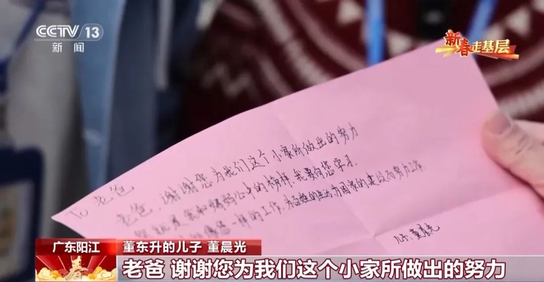 儿子董晨光说:“老爸,谢谢您为我们这个小家所做出的努力,您就是我和妈妈心目中的榜样,我要向您学习,将来想做像您一样的工作,为百姓的生活和国家的建设作出贡献,爸爸辛苦了。”