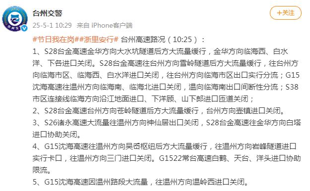 4.G15沈海高速往温州方向吴岙枢纽后方大流量缓行,往温州方向岩峰隧道进口实行卡口,往温州方向三门进口关闭。G1522常台高速白鹤、天台、洋头进口协助限流。